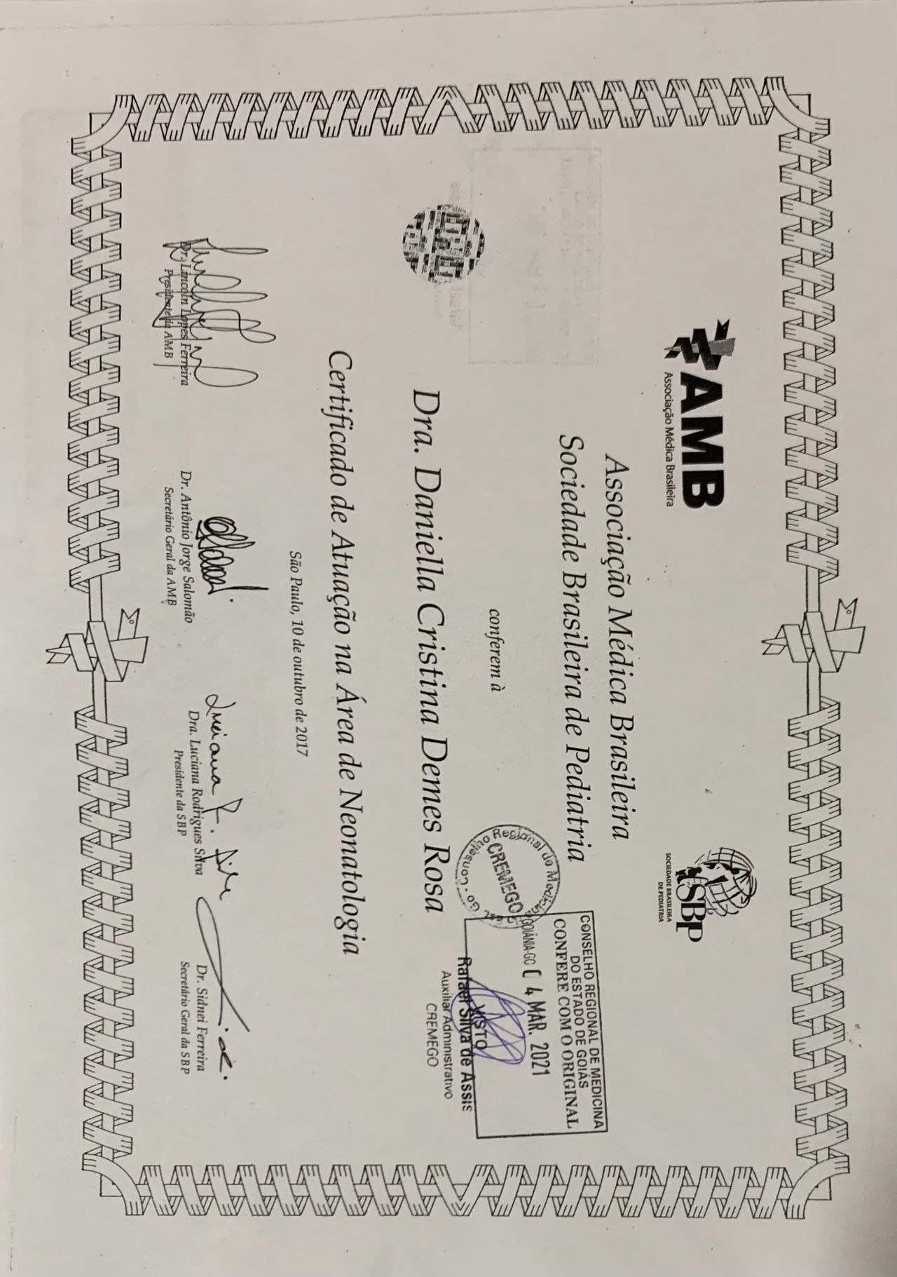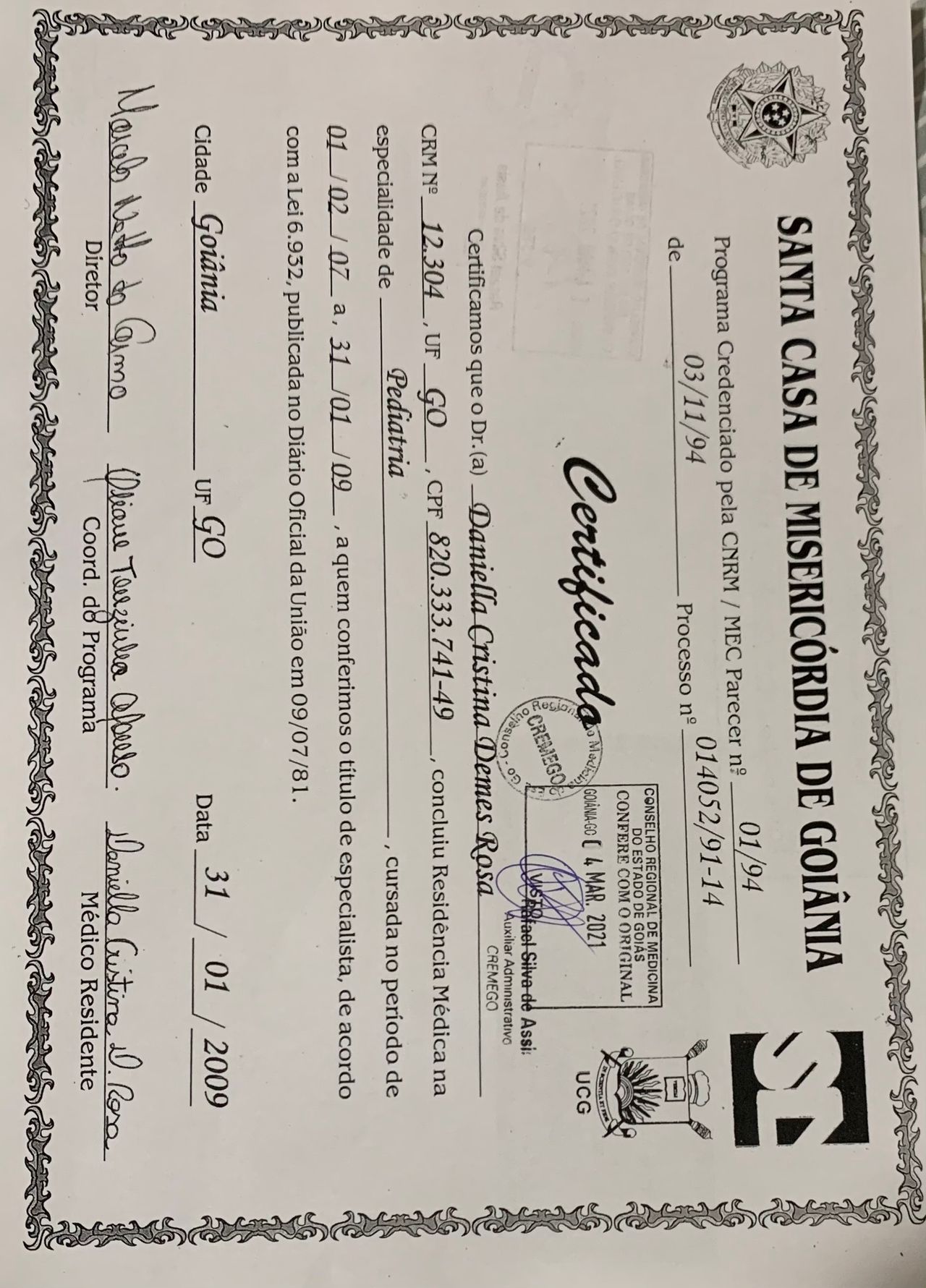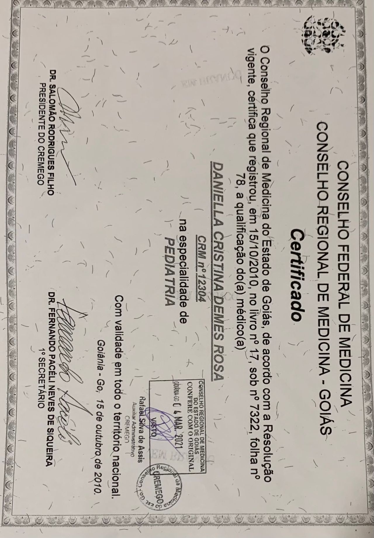 Número de registro: CRM GO 12304 - RQE Nº: 7322 Pediatria - RQE Nº: 12084 Neonatologia - TEN-AMB e SBP 170952