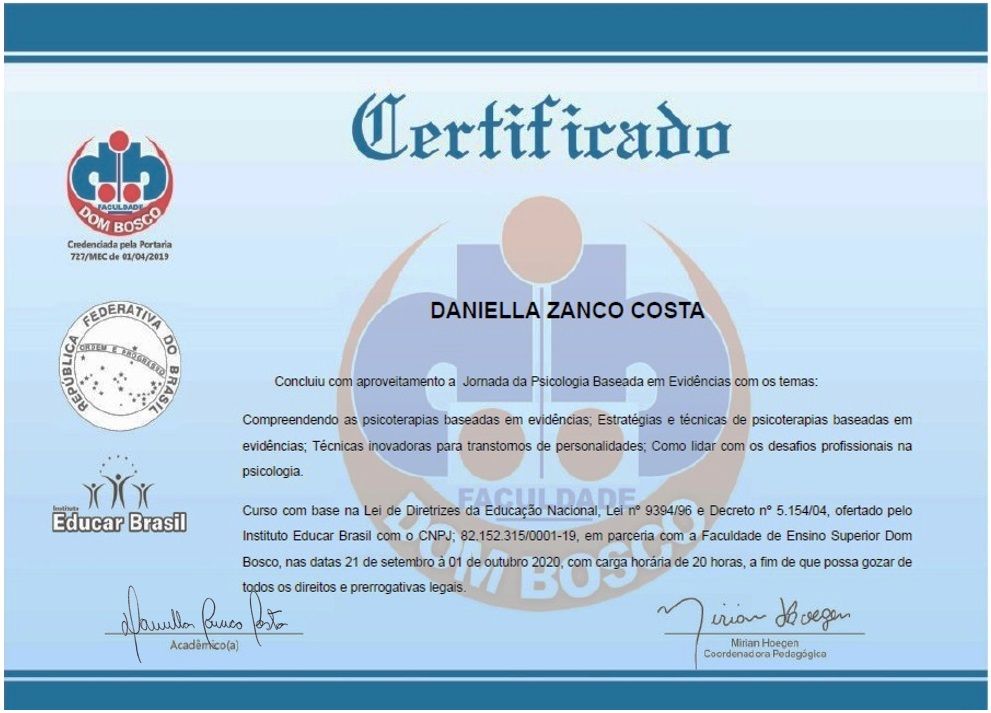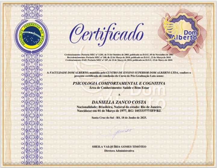 Sou Daniella Zanco, Psicóloga Clínica com forte atuação no atendimento de adolescentes, jovens, adultos e idosos, individualmente e casais. Tenho a Terapia Cognitivo Comportamental (TCC) como minha práxis normal de trabalho, reforçada pela adaptação das abordagens com a singularidade de cada paciente.