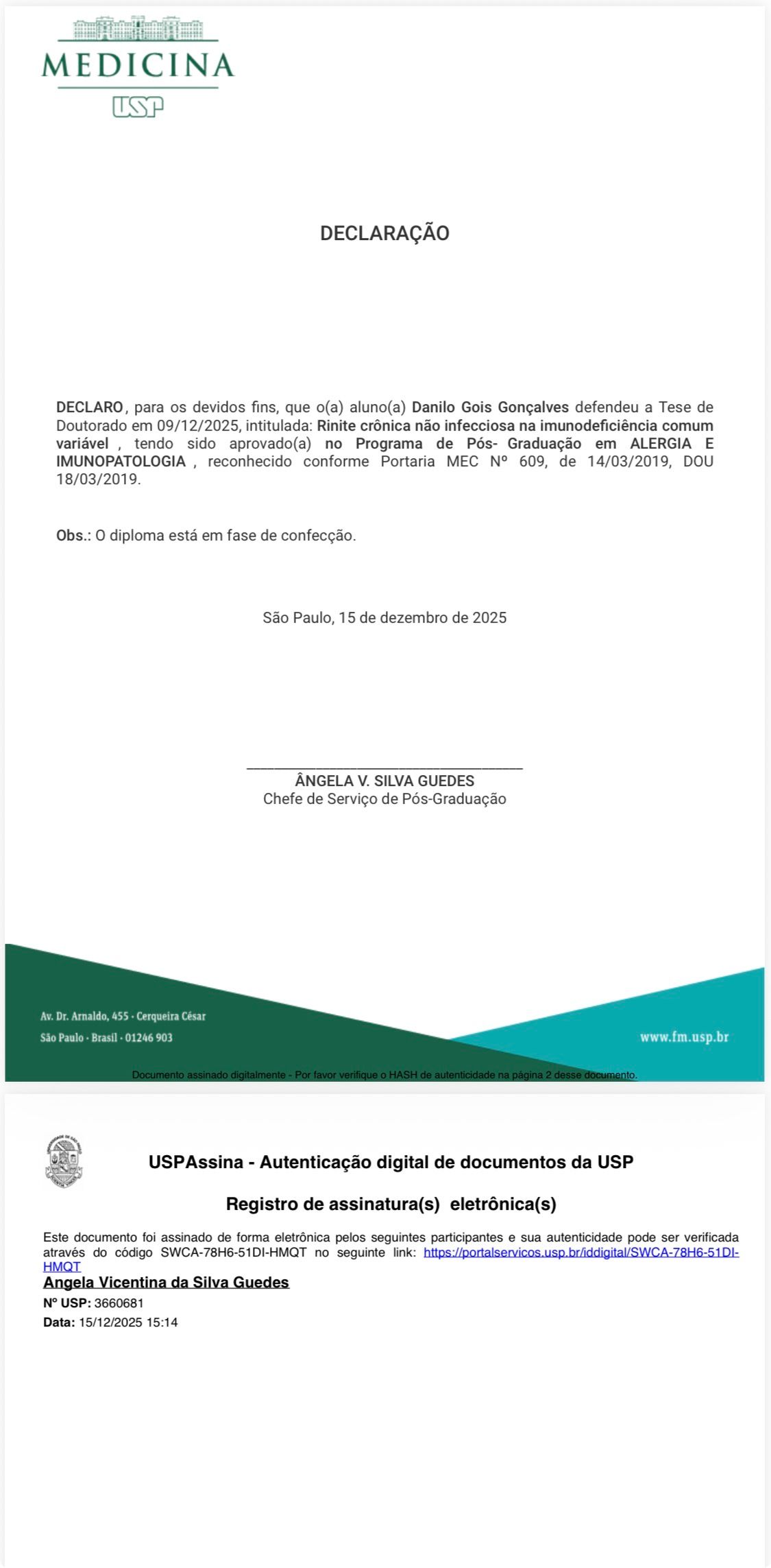 Atendimento médico especializado em Alergia e Imunologia, voltado ao diagnóstico, tratamento e acompanhamento individualizado de doenças alérgicas e imunológicas em adultos e crianças. Atuação em rinite alérgica, asma, sinusite crônica, conjuntivite alérgica, dermatite atópica e de contato, urticária, angioedema, anafilaxia, alergias alimentares e medicamentosas, alergia a veneno de insetos, esofagite eosinofílica, doenças autoimunes e inflamatórias, mastocitose, síndrome de ativação mastocitária, erros inatos da imunidade e imunodeficiências secundárias. Formação em Clínica Médica pela UNIFESP e em Alergia e Imunologia pela Faculdade de Medicina da USP. Doutorado em Alergia e Imunopatologia pela Faculdade de Medicina da USP.
