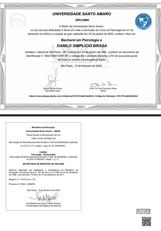 Sou psicólogo de abordagem humanista, com foco na escuta acolhedora e na construção de um vínculo verdadeiro. Trabalho com pessoas de todas as idades, e sempre priorizo a singularidade e as necessidades de cada um. Fora do espaço terapêutico, sou alguém que aprecia muito estar com as pessoas amadas, sejam amigos ou familiares.