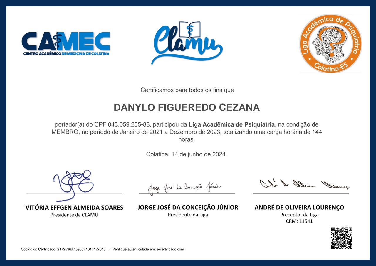 Quais são as principais especialidades de Danylo Figueredo Cezana?Danylo Figueredo Cezana é psiquiatra. Te mostramos alguns dos serviços oferecidos pelo especialista graças à sua trajetória e vasta experiência: Teleconsulta, Tratamento da ansiedade, Consulta de retorno, Tratamento para anorexia nervosa, Tratamento para compulsão alimentar, Tratamento da insônia, Tratamento para bulimia nervosa, Tratamento de obesidade, Transtorno de déficit de atenção e hiperatividade - TDAH, Tratamento da esquizofrenia e outros transtornos psicóticos.