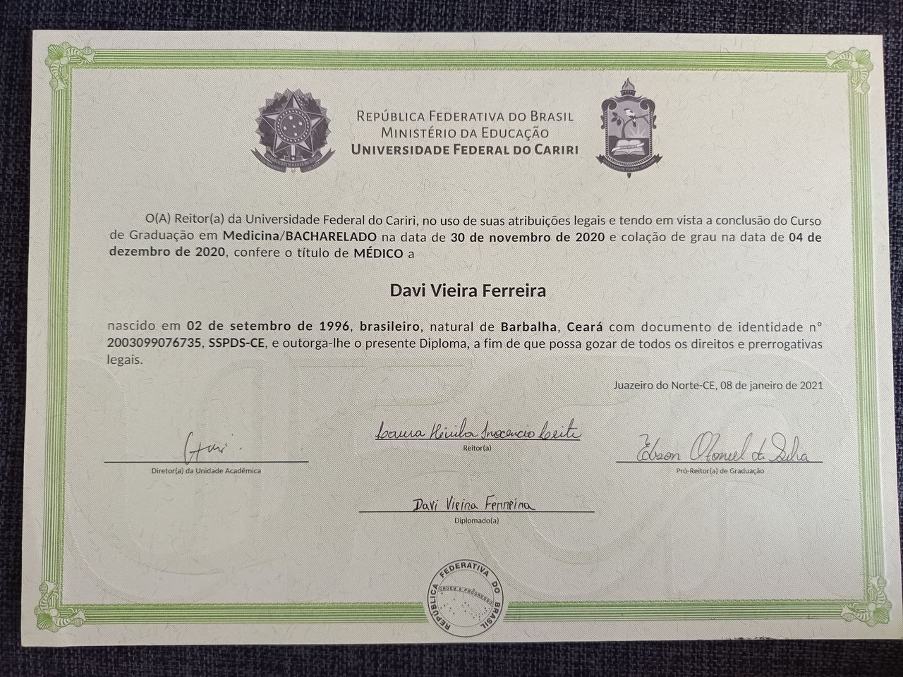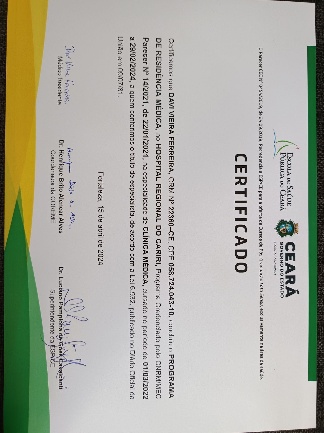 Médico formado pela UFCA, com residência em Clínica Médica (Hospital Regional do Cariri) e residência em Reumatologia (Hospital Geral de Fortaleza).