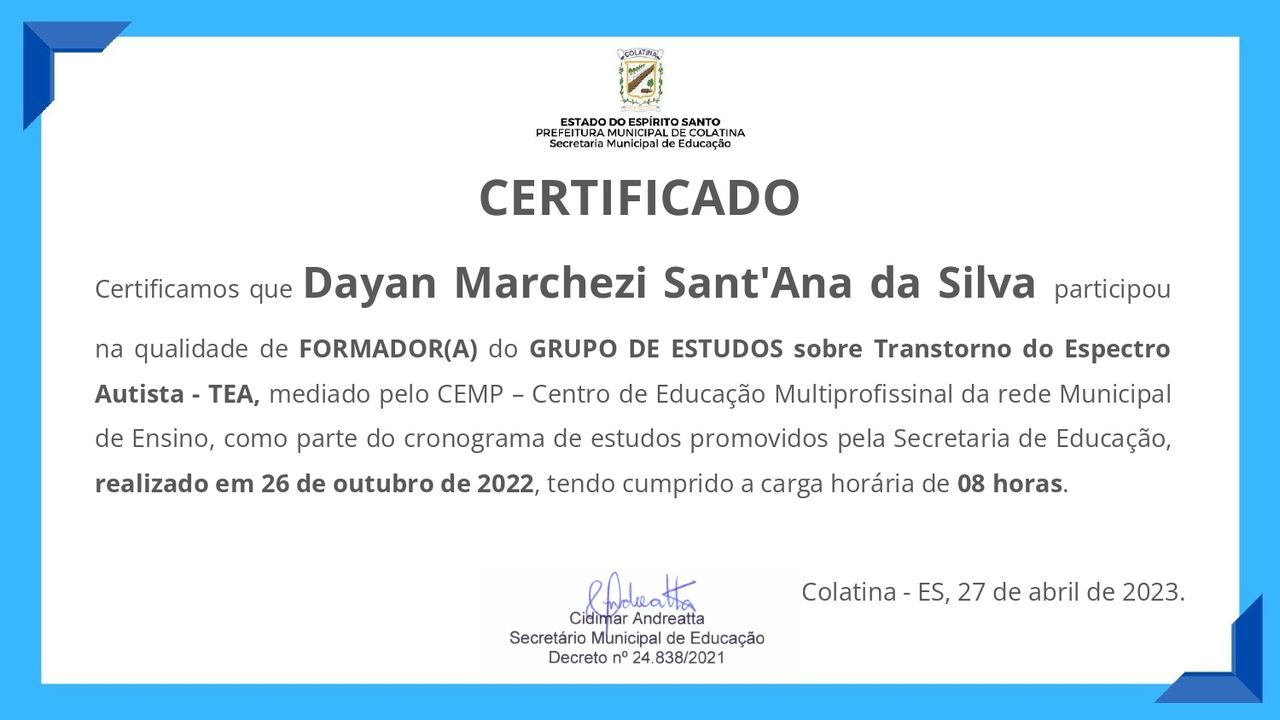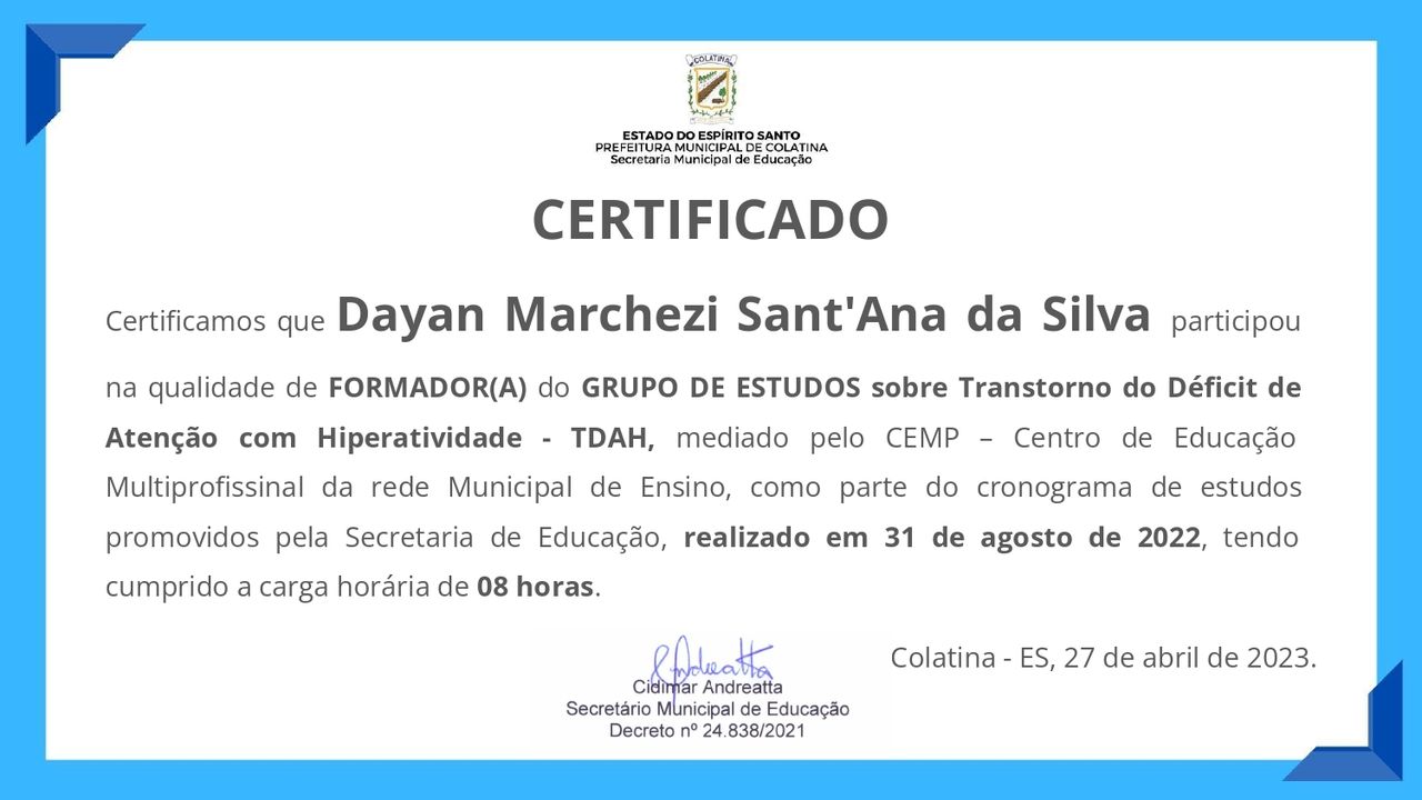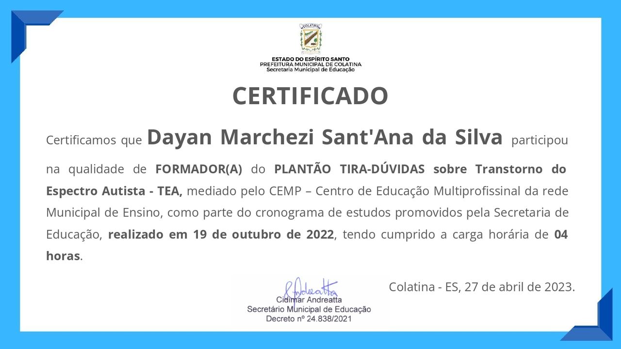 Como posso marcar uma consulta com Dayan Marchezi Sant'Ana da Silva?O calendário que Dayan Marchezi Sant'Ana da Silva exibe em seu perfil na Doctoralia é atualizado em tempo real. Tudo o que precisa é escolher o dia e a hora que forem mais convenientes para você. O agendamento é gratuito e você também recebe um lembrete antes da consulta.