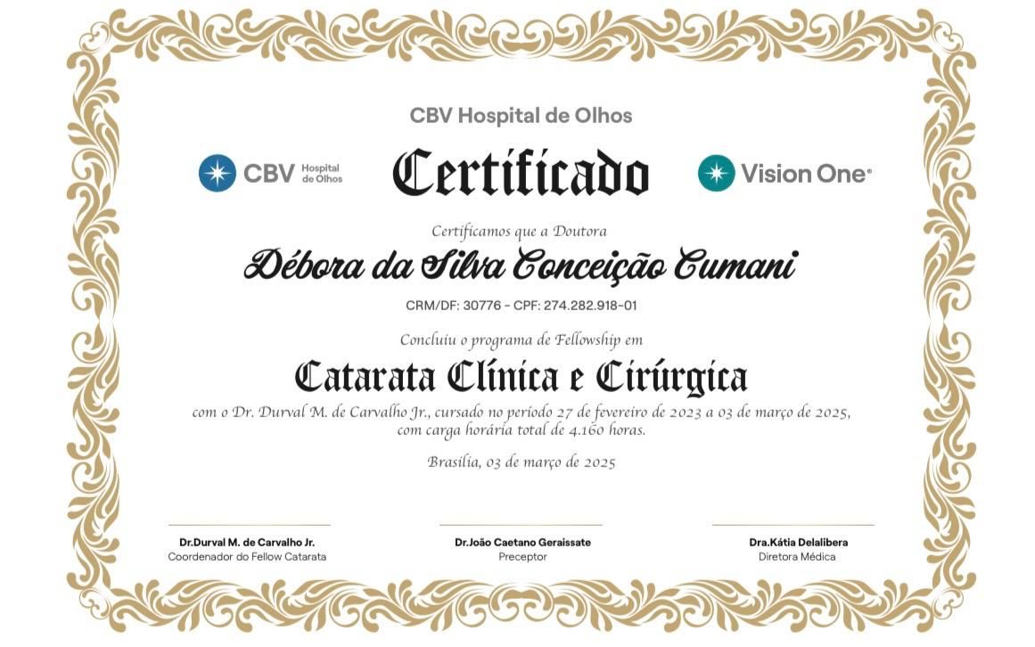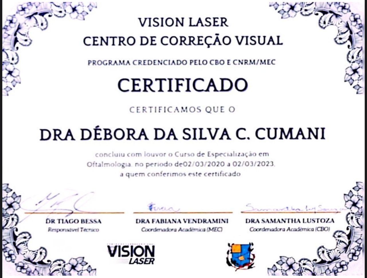 Quais são as principais especialidades de Débora Cumani?Débora Cumani é oftalmologista. Te mostramos alguns dos serviços oferecidos pelo especialista graças à sua trajetória e vasta experiência: Teleconsulta, Primeira consulta Oftalmologia, Retinografia, Curva tensional diária, Campimetria, Biometria óptica, Yag laser (limpeza de lente), Retorno de consultas Oftalmologia, Consulta convênio, Consulta particular.