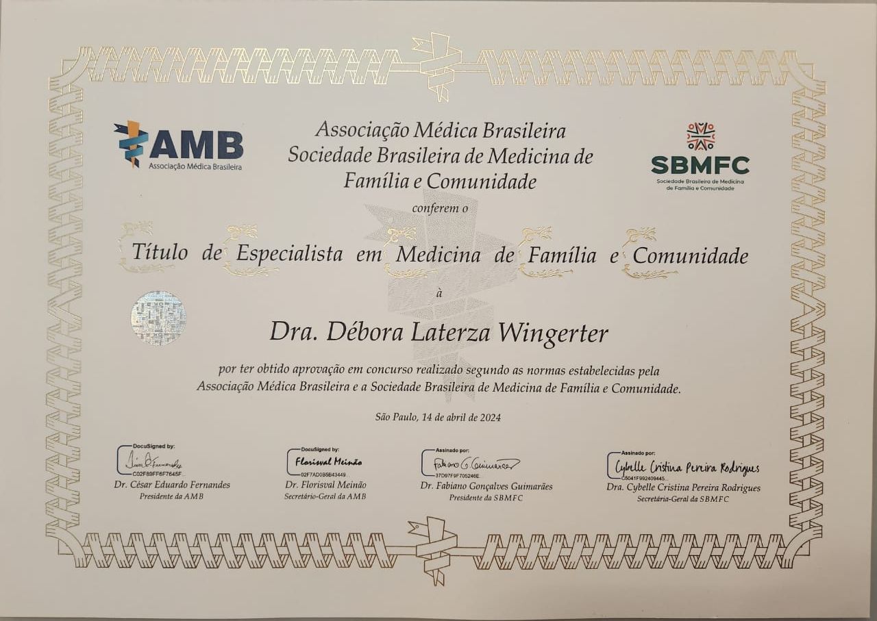 Quais são as principais especialidades de Debora Laterza Wingerter?Debora Laterza Wingerter é médica de família, médica clínica geral. Te mostramos alguns dos serviços oferecidos pelo especialista graças à sua trajetória e vasta experiência: Primeira consulta clínica médica, Teleconsulta, Acompanhamento de pacientes com hipertensão e colesterol, Tratamento para Hipertensão, Exame de colesterol, Consulta avaliação de diabetes, Consulta saúde da criança, Acompanhamento de crianças, Atenção integral à saúde do adolescente, Check up.