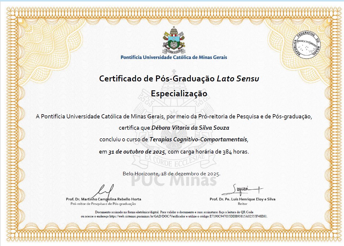 Olá! Meu nome é Débora e sou psicóloga clínica. Sou especialista em Terapia Cognitivo-Comportamental pela PUC Minas, buscando sempre oferecer um atendimento baseado na ciência, mas sem perder de vista o que nos torna humanos. Acredito que, mais do que técnicas e estratégias, a psicoterapia é um espaço de acolhimento, escuta e construção conjunta. Cada pessoa carrega sua própria história, desafios e potencialidades, e meu compromisso é te ajudar a compreender seus pensamentos, emoções e comportamentos de forma leve e transformadora. Será um prazer te acompanhar nessa jornada de autoconhecimento e bem-estar. Sinta-se à vontade para entrar em contato!