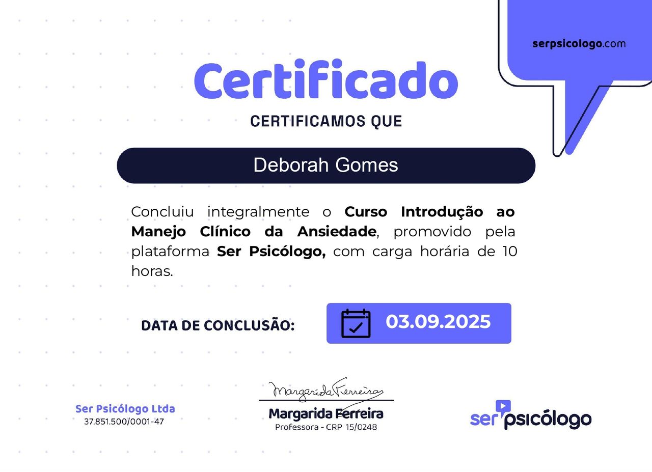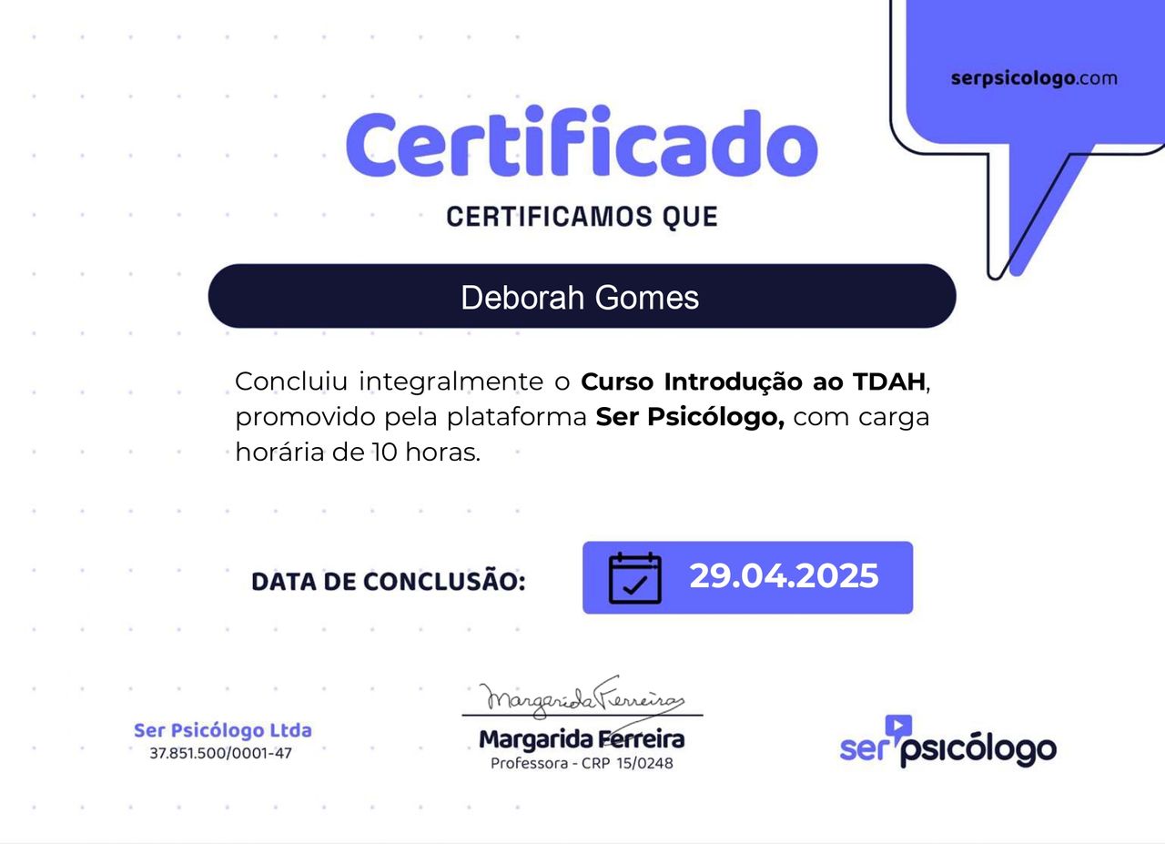 Quais são as principais especialidades de Deborah Gomes?Deborah Gomes é psicóloga. Te mostramos alguns dos serviços oferecidos pelo especialista graças à sua trajetória e vasta experiência: Psicoterapia Criança, Psicoterapia, Psicoterapia online, Consulta psicológica do idoso, Psicoterapia adulto, Orientação profissional, Transtorno de déficit de atenção e hiperatividade - TDAH, Terapia ABA, Atendimento psicológico online, Consulta psicológica do adulto.
