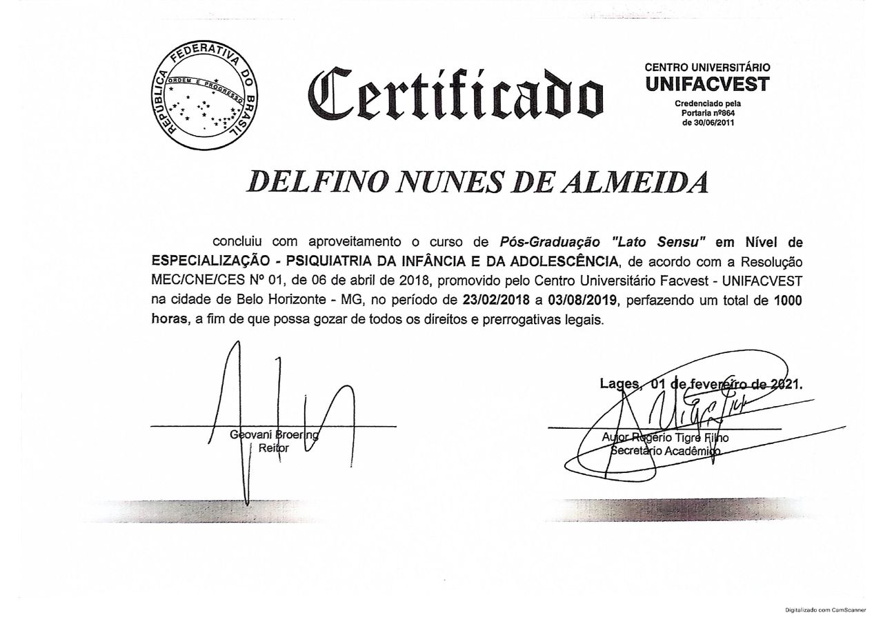 Quais são as principais especialidades de Delfinus Nunes de Almeida?Delfinus Nunes de Almeida é generalista. Te mostramos alguns dos serviços oferecidos pelo especialista graças à sua trajetória e vasta experiência: Teleconsulta, Consulta tratamento com canabidiol, Prescrição e orientação de canabidiol, Medicina endocanabinoide (canabidiol), Medicina fitocanabinóide : canabidiol (CBD), Tratamento da ansiedade, Consulta generalista, Transtorno de déficit de atenção e hiperatividade - TDAH, Tratamento com cannabidiol, Terapia Cognitivo Comportamental.