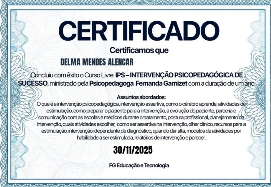 Além disso, realizei Curso de Extensão em Prática de Atendimento Psicopedagógico 2.0, aprofundando técnicas e estratégias modernas para acompanhamento clínico.