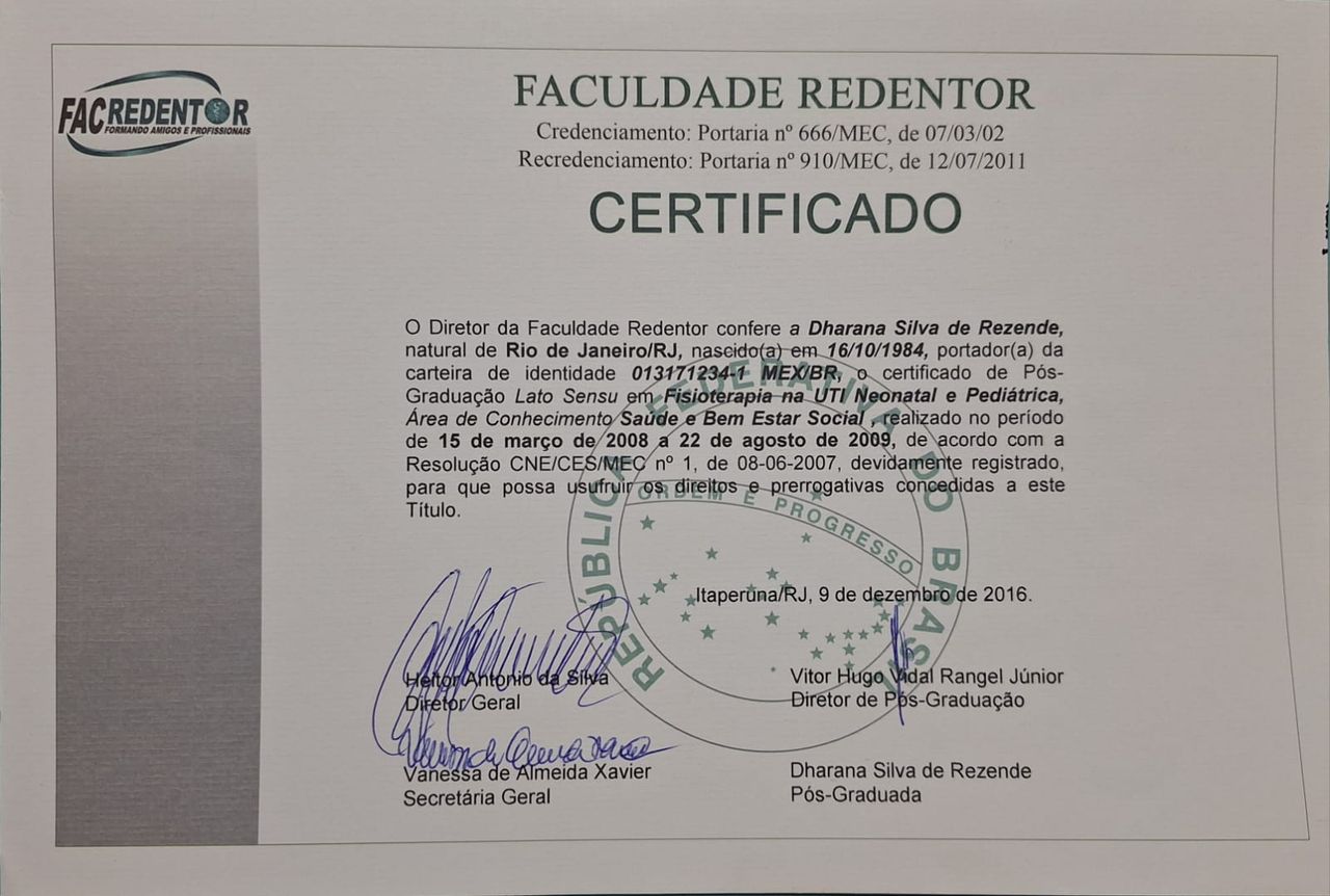 Minha formação inclui especialização em Fisioterapia na Unidade de Terapia Intensiva Neonatal e Pediátrica (Interfisio), pós-graduação em Cuidados Paliativos e diversos cursos que ampliam meu olhar e minha prática clínica, como Aleitamento Materno, Torcicolo Muscular Congênito (TMPI), Excelência Clínica em bebês, além de formações nos métodos RTA, Therapy Taping e Busquet.