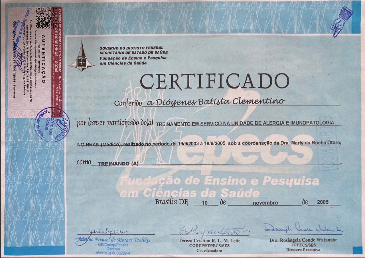 Quais são as principais especialidades de Diogenes Batista Clementino?Diogenes Batista Clementino é pediatra, alergista. Te mostramos alguns dos serviços oferecidos pelo especialista graças à sua trajetória e vasta experiência: Consulta de Alergia e Imunologia (adultos e crianças), Consulta de retorno, Consulta Pediatria, Teste alérgico.