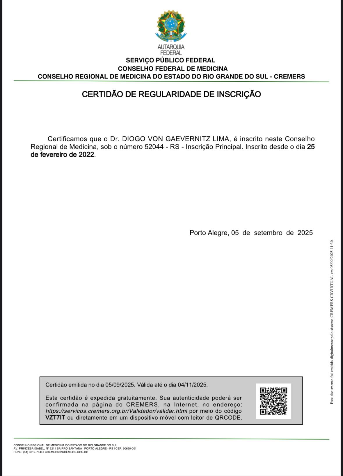 Quando poderia me consultar com Diogo Von Gaevernitz Lima?Diogo Von Gaevernitz Lima costuma ter horários disponíveis dentro da mesma semana ou para a semana seguinte. Verifique o calendário: você verá o primeiro horário disponível, atualizado em tempo real. Caso o horário sugerido não funcione para você, verifique outras datas. Agendar uma consulta é sempre imediato e gratuito.