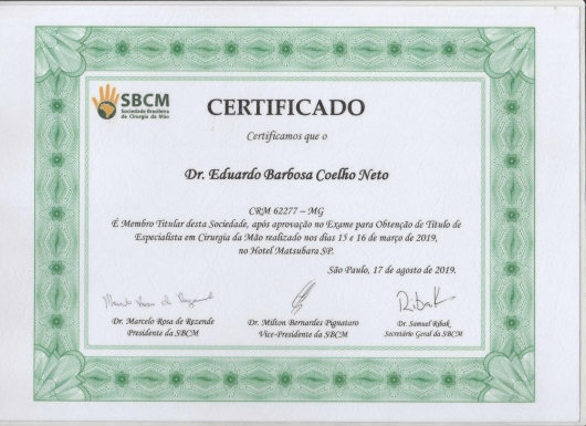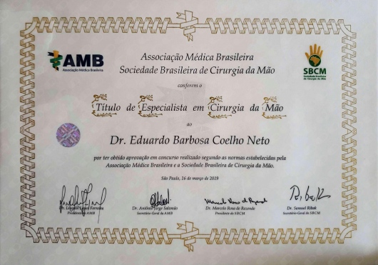 Título de Especialista em Cirurgia da Mão pelo Conselho Federal de Medicina - RQE 18109