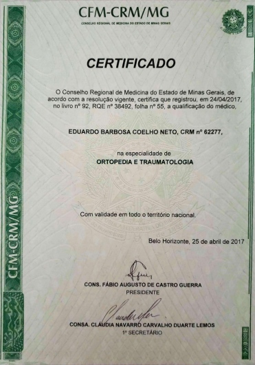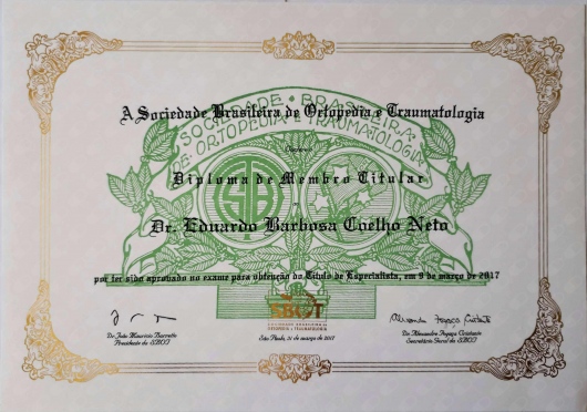 Título de Especialista em Ortopedia e Traumatologia pelo Conselho Federal de Medicina - RQE 17857