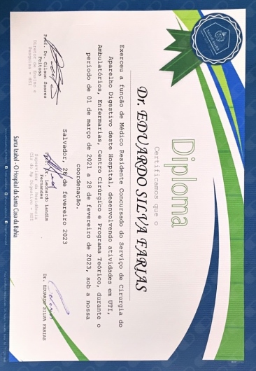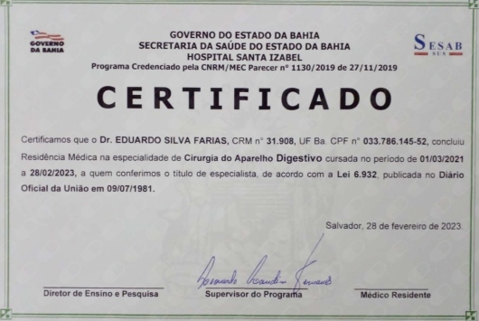Número de registro: CRM BA 31908 CRM SE 5687 RQE SE Cirurgião do aparelho digestivo Nº: 4868 RQE Não Encontrado (CIRURGIÃO GERAL)