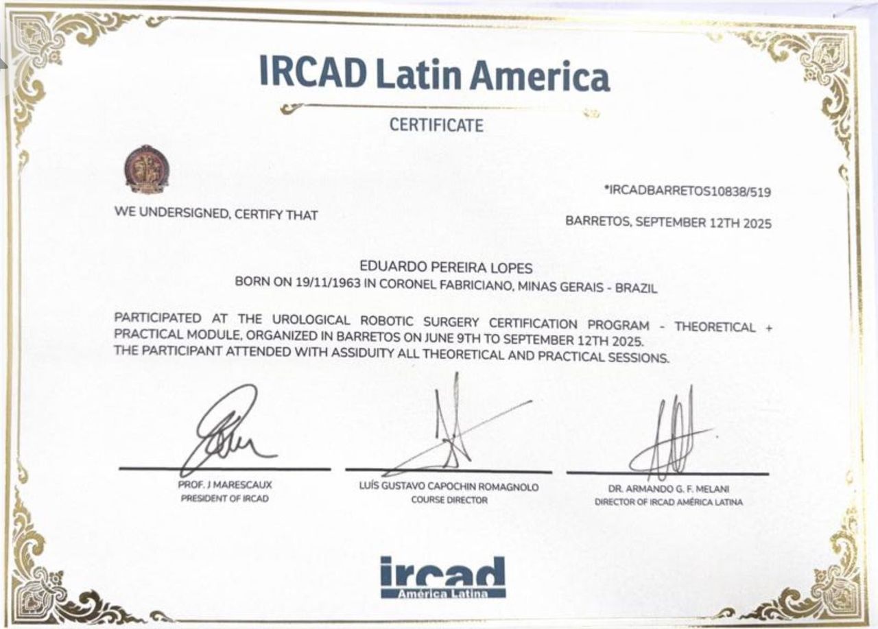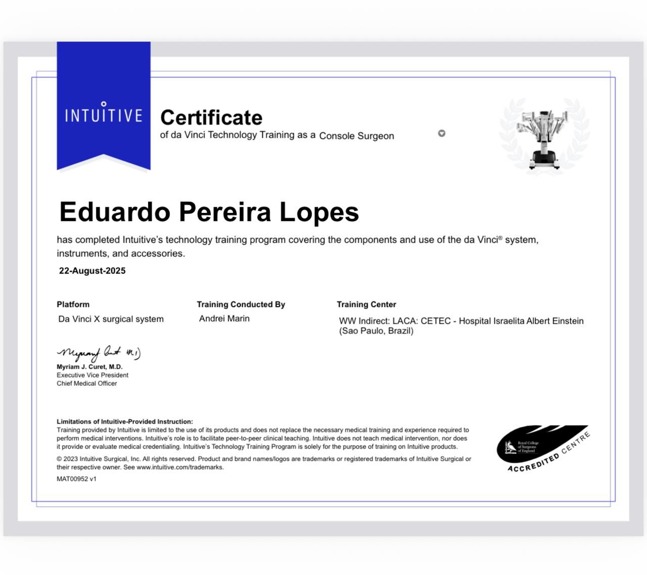 Possuo certificação em cirurgia robótica pelo IRCAD Brasil, em Barretos, certificação internacional pela Intuitive Surgical e título pelo Colégio Brasileiro de Cirurgiões.