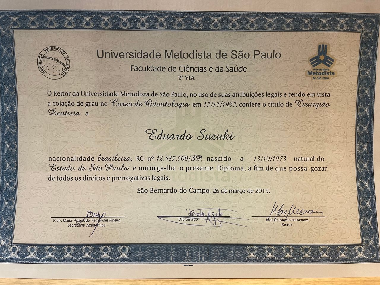 Quais são as principais especialidades de Eduardo Suzuki?Eduardo Suzuki é dentista. Te mostramos alguns dos serviços oferecidos pelo especialista graças à sua trajetória e vasta experiência: Primeira consulta Odontológica, Prótese parcial removível, Placa de mordida para bruxismo, Implantes dentários, Prótese sobre implantes, Protese tipo protocolo sobre implantes, Facetas de porcelana, Raspagem periodontal, Preenchimento facial, Coroas em cerâmica.