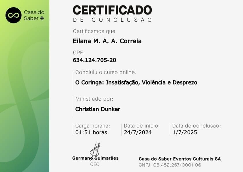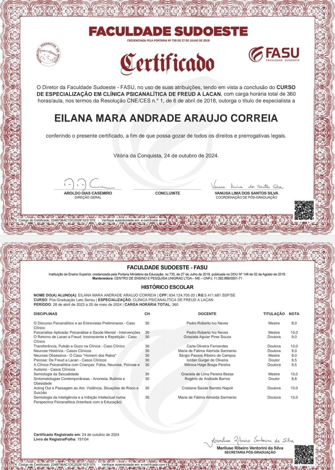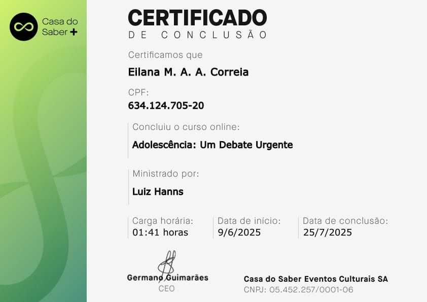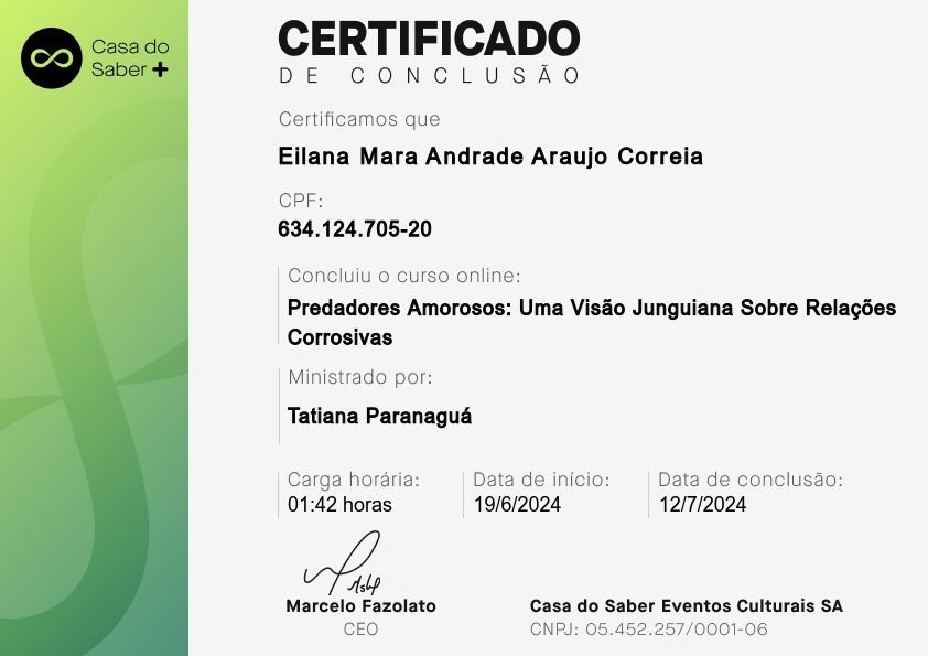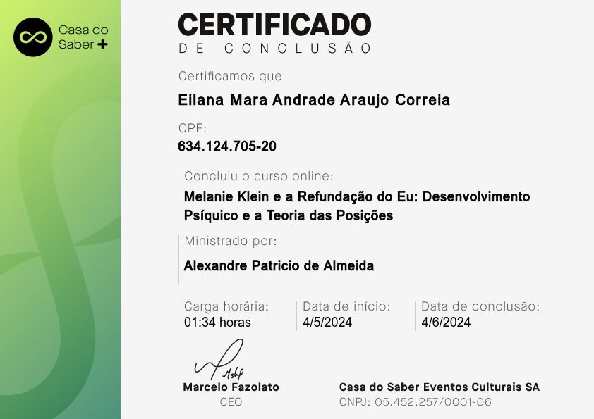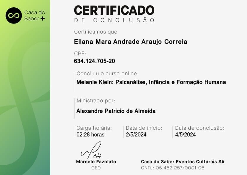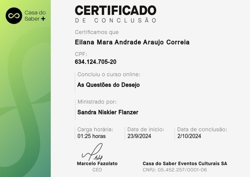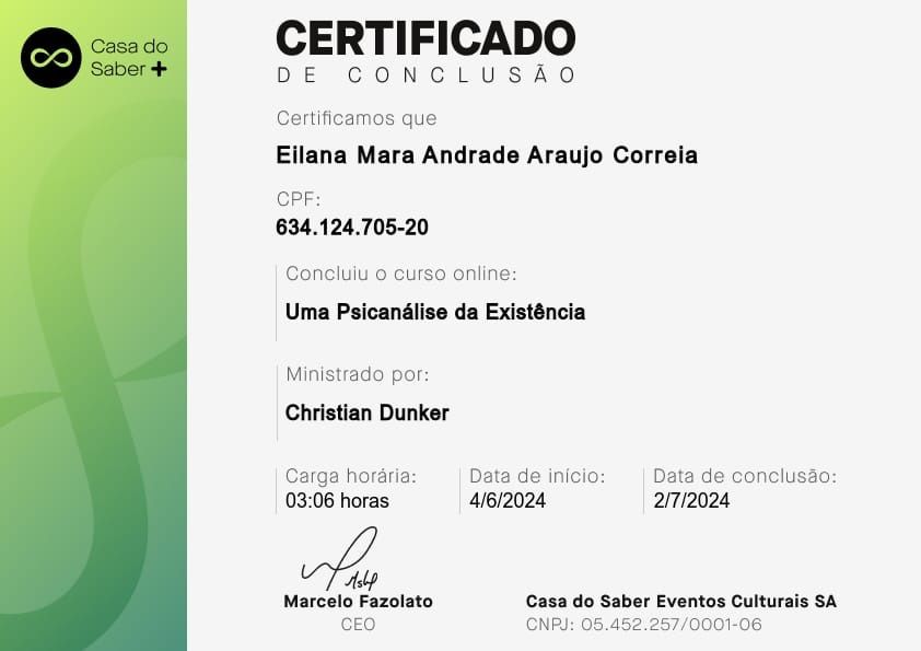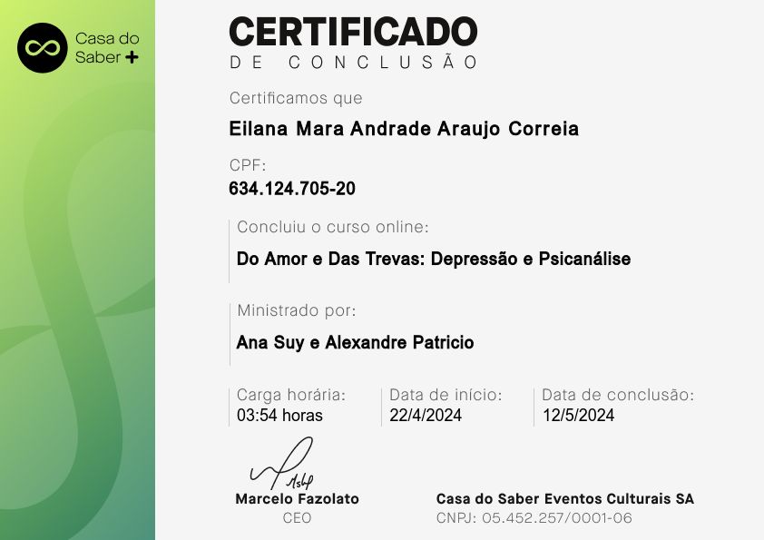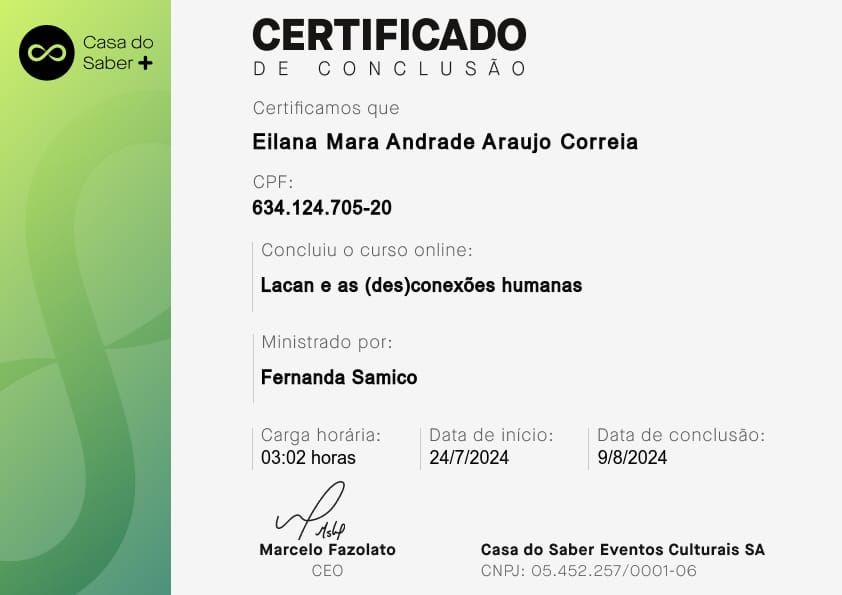 Psicóloga clínica, pós-graduada em Clínica Psicanalítica de Freud a Lacan. A minha área de atuação é: Sintomatologia Contemporânea, Clínica dos Afetos (Emoções, Sentimentos e Paixões, Depressão, Ansiedade, Fobia, Luto, Transtorno Obsessivo-compulsivo, Doenças Psicossomáticas), Clínica dos Excessos (Toxomania, Compulsões, Inibições e Adições), Clínica da Dor (Dores crônicas e Fibromialgia).