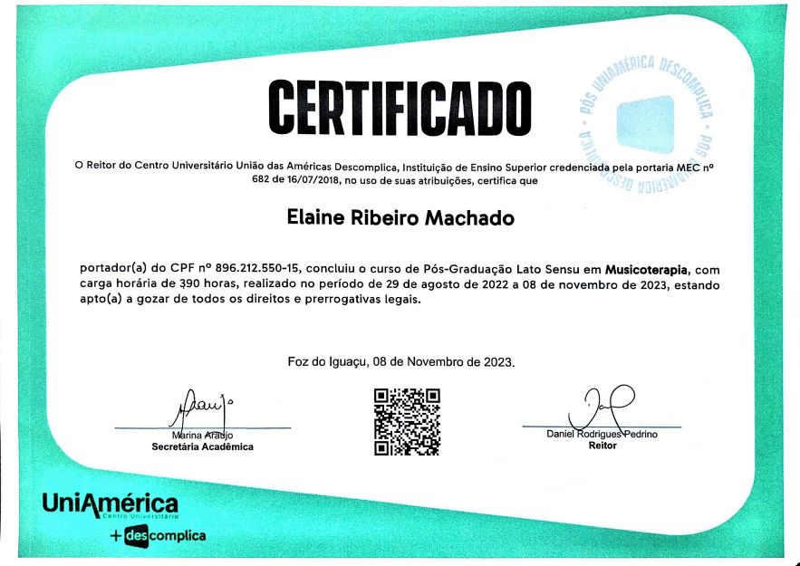 Sou licenciada em música pelo IPA, e pós graduada em musicoterapia e educação musical. Já fui professora de música na educação infantil, dei aulas de violão e canto. Descobri na área da saúde um novo propósito profissional, utilizar a música que tanto amo, para auxiliar e desenvolver pessoas promovendo saúde e bem estar.