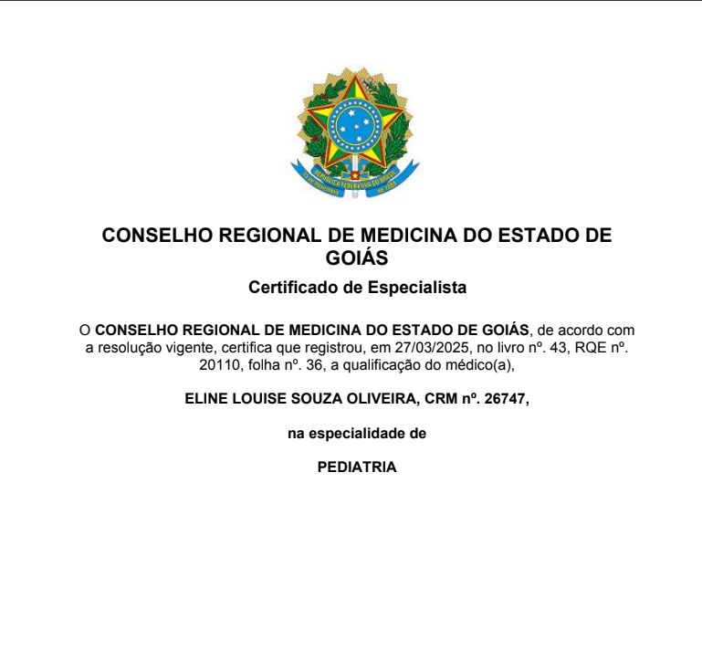 Quais são as principais especialidades de Eline Louise Souza Oliveira?Eline Louise Souza Oliveira é pediatra. Te mostramos alguns dos serviços oferecidos pelo especialista graças à sua trajetória e vasta experiência: Consulta Pediatria, Consulta médica.