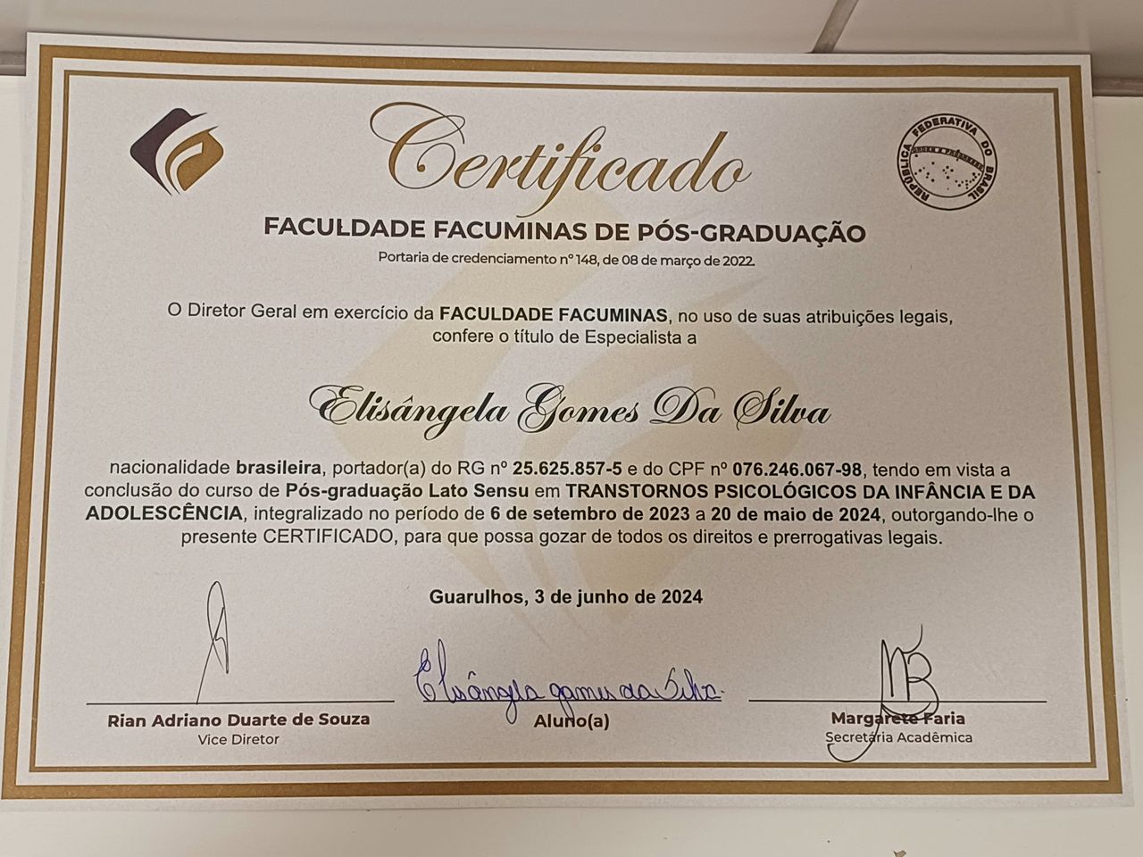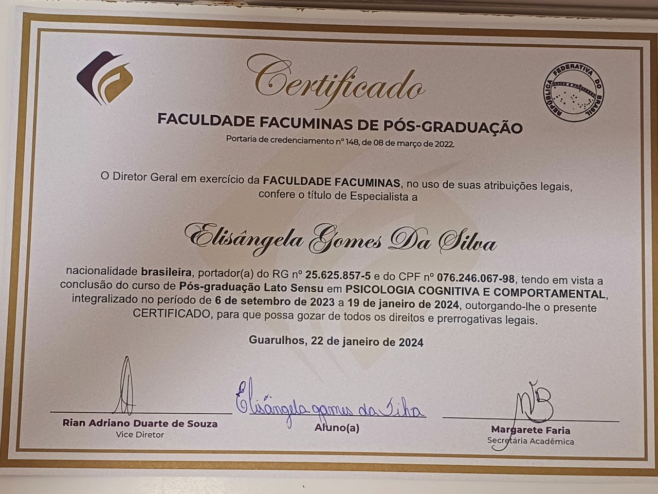 Olá! Sou Elisângela, psicóloga clínica há sete anos. Atuo no tratamento da ansiedade, depressão, fobias, estresse pós-traumático, desafios emocionais, baixo auto estima,com um olhar humano, ético e acolhedor, sempre priorizando o bem-estar do paciente.