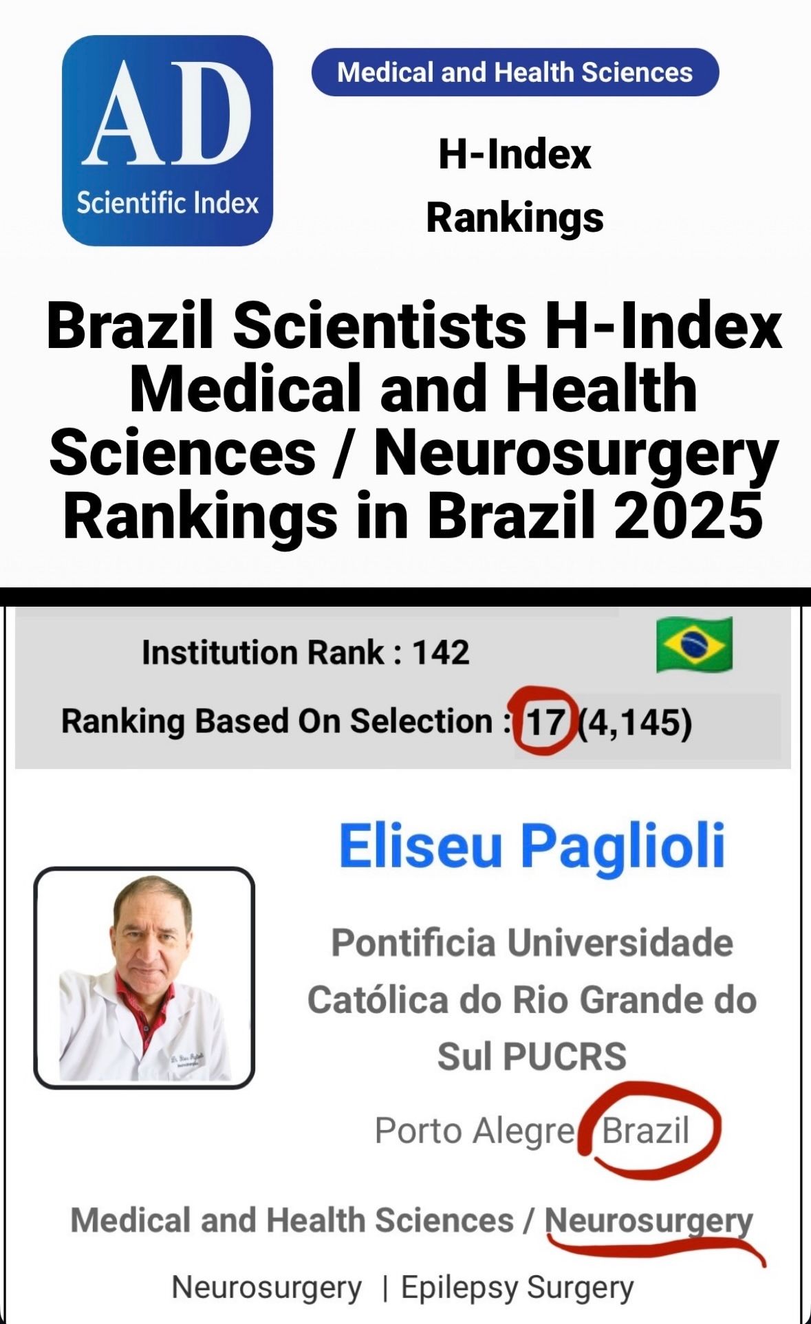 Fundador e Diretor Cirúrgico do Serviço de Cirurgia da Epilepsia de Porto Alegre desde 1992, com mais de 2600 pacientes operados, vindos de todos os estados do Brasil. Adultos e crianças.