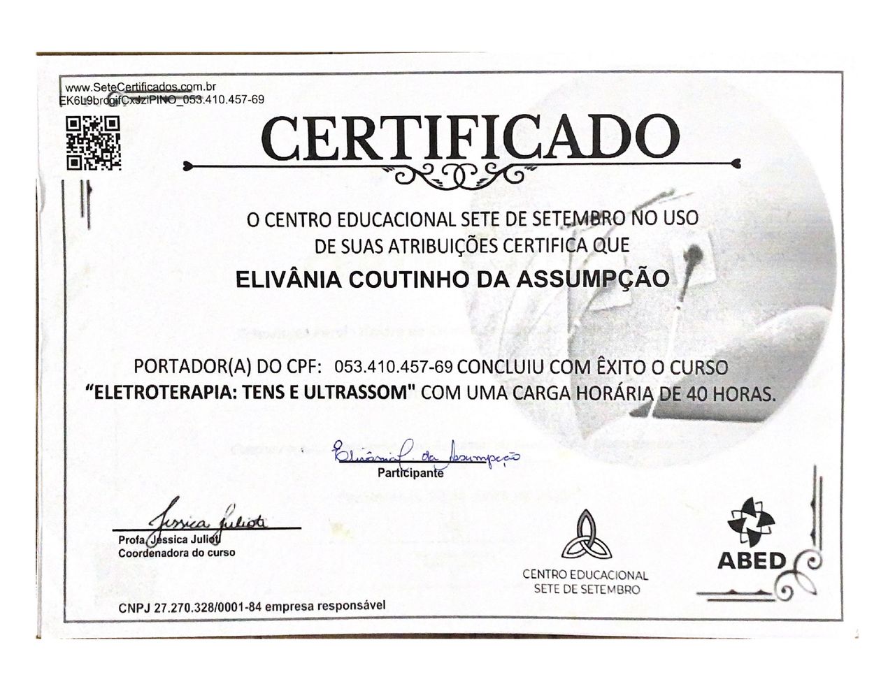 Quais são as principais especialidades de Elivânia Coutinho de Assumpção?Elivânia Coutinho de Assumpção é fisioterapeuta. Te mostramos alguns dos serviços oferecidos pelo especialista graças à sua trajetória e vasta experiência: Fisioterapia.
