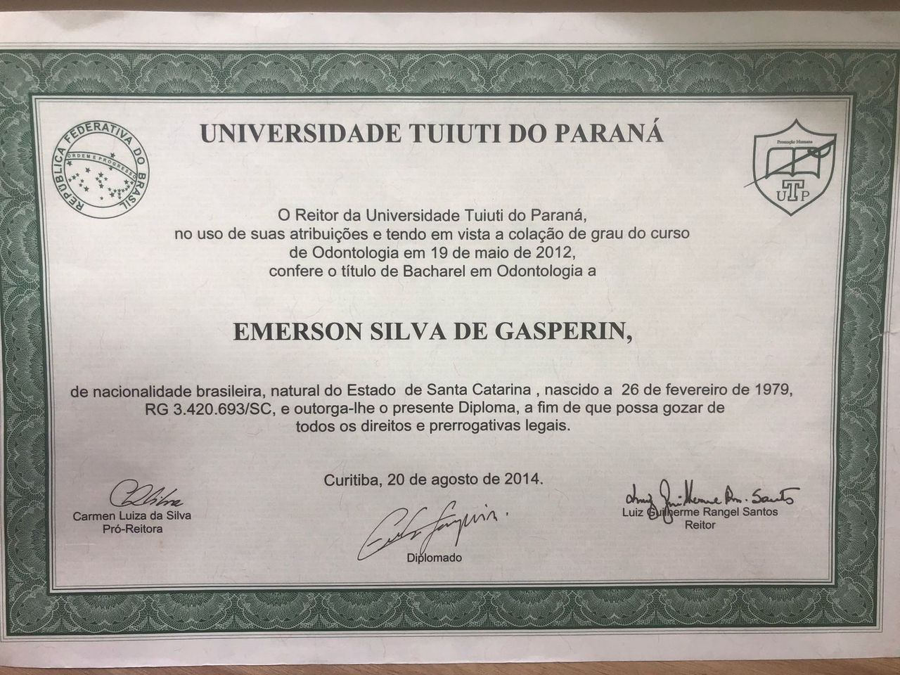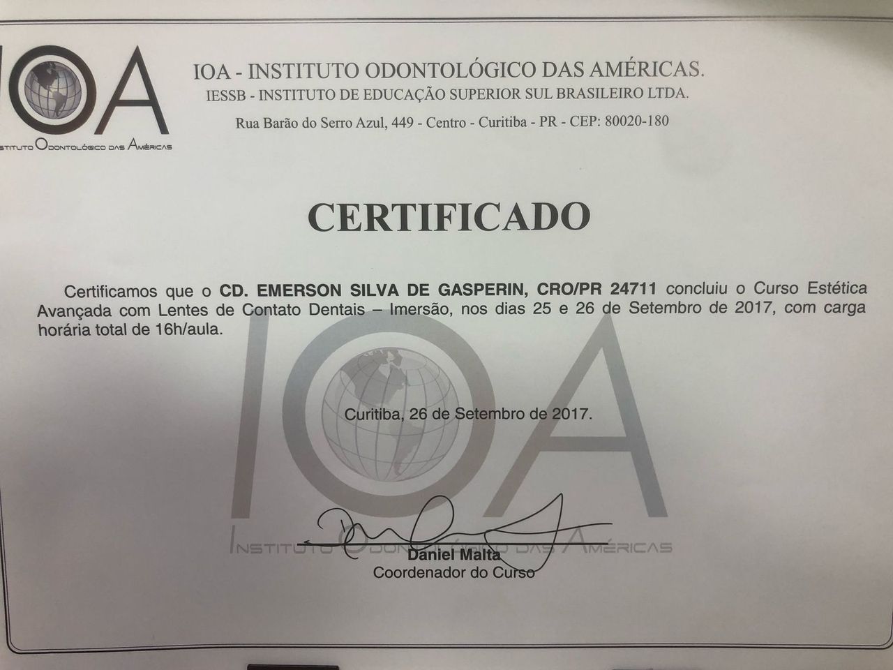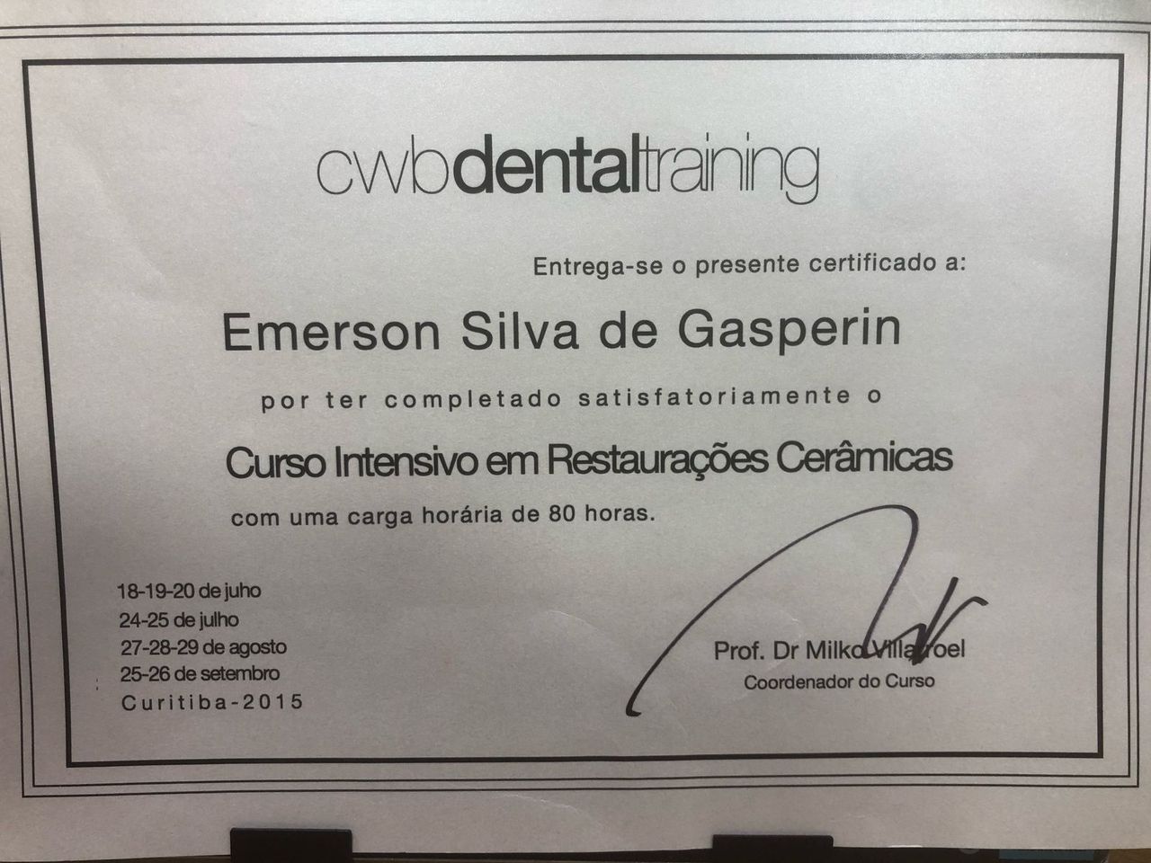 Emerson Gasperin é dentista. Te mostramos alguns dos serviços oferecidos pelo especialista graças à sua trajetória e vasta experiência: Primeira consulta Odontológica, Clareamento dental, Consulta Dentista, Facetas de porcelana, Protocolo com carga imediata, Profilaxia, Restauração dental, Avaliação para Implantes, Implante dentário sem enxerto, Cirurgia de implante.