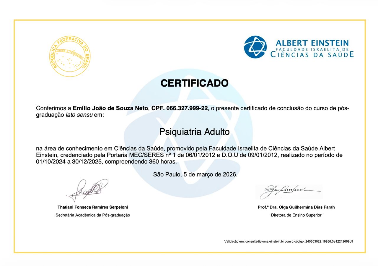 Pós-graduado em Psiquiatria do Adulto (Hospital Israelita Albert Einstein).
