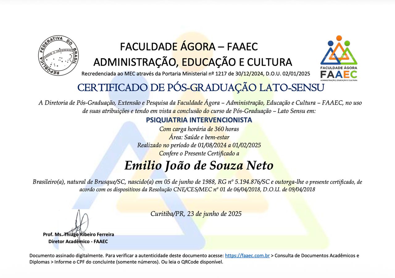 Pós-graduado em Psiquiatria Intervencionista (FAAEC-PR).