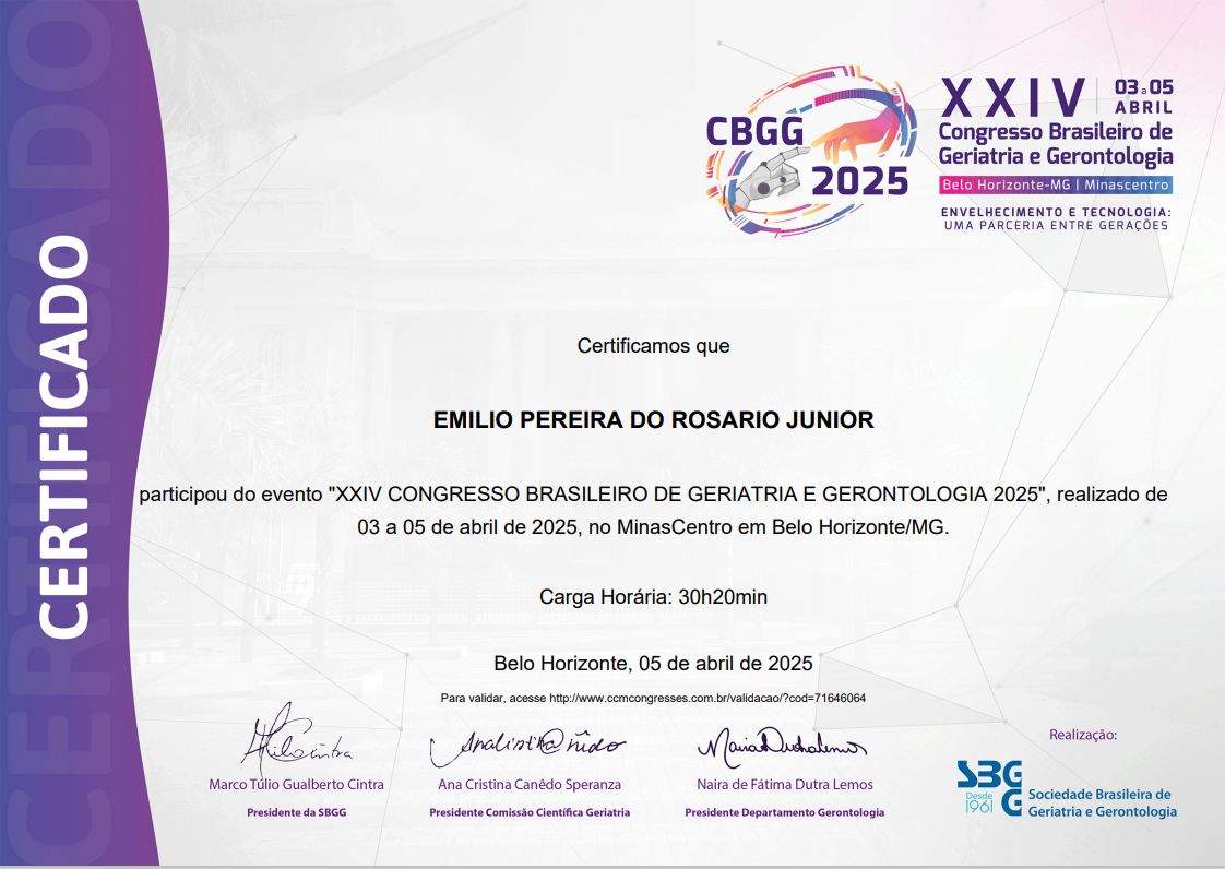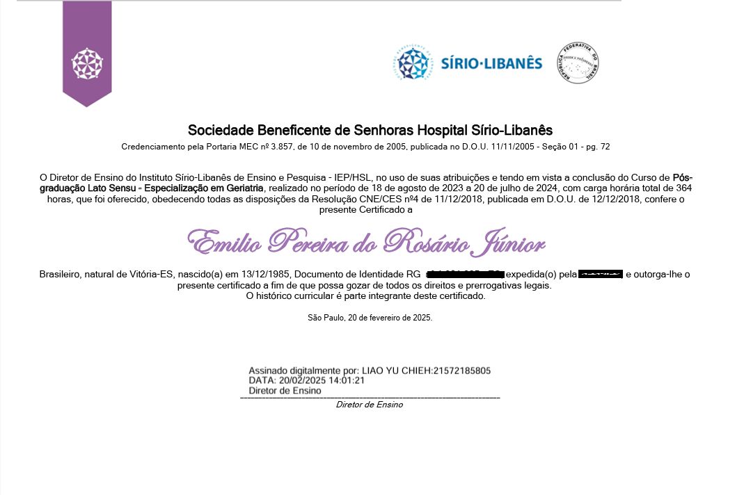 • Pós Graduação em Geriatria pelo Hospital Sírio-Libanês, São Paulo: 2024.