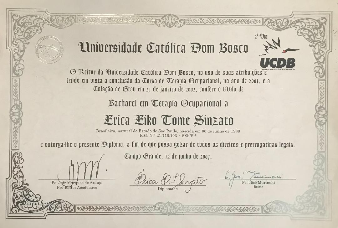 Quais são as principais especialidades de Éricka Sinzato?Éricka Sinzato é terapeuta ocupacional. Te mostramos alguns dos serviços oferecidos pelo especialista graças à sua trajetória e vasta experiência: Teleconsulta, Atendimento individual de Terapia Ocupacional, Confecção de órtese de MMSS, Consulta Terapia Ocupacional.