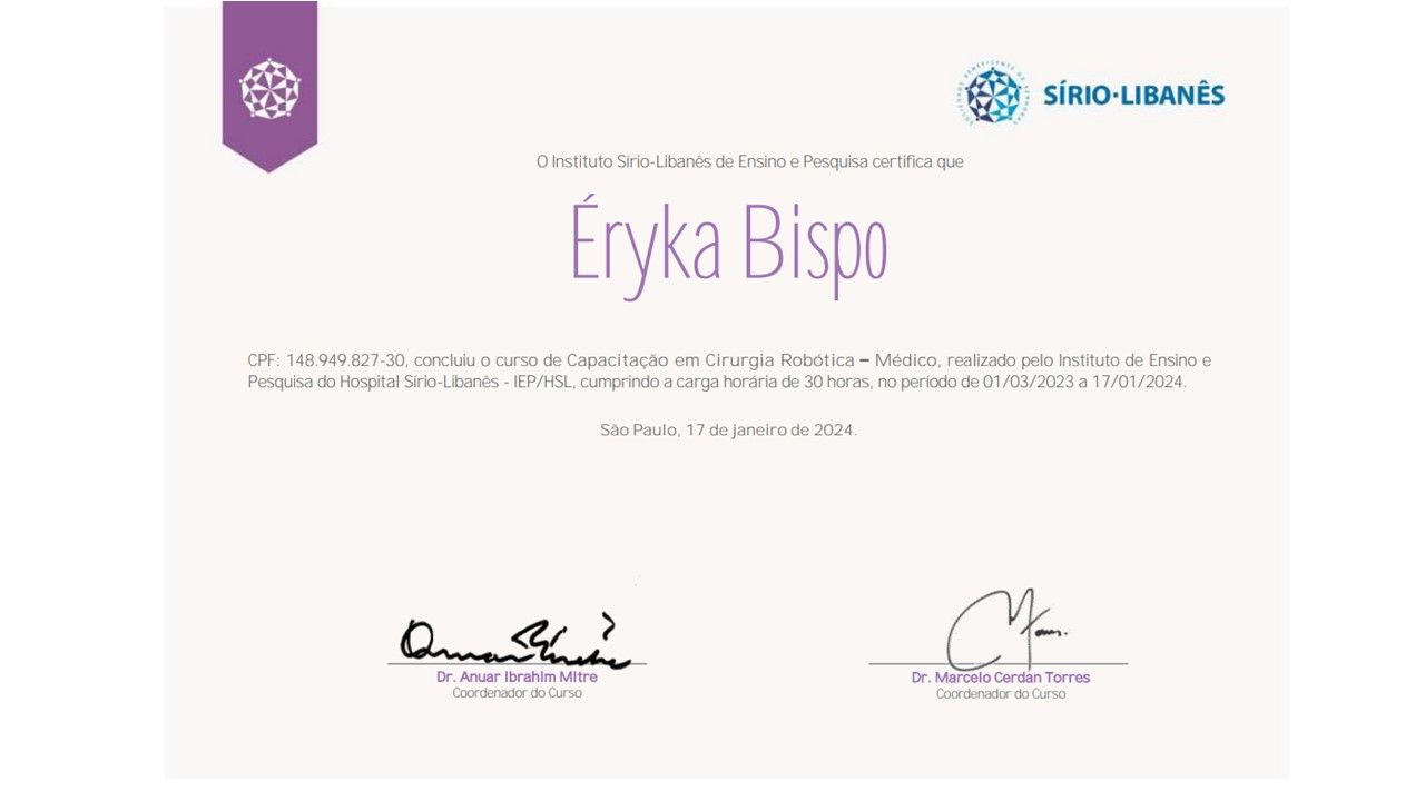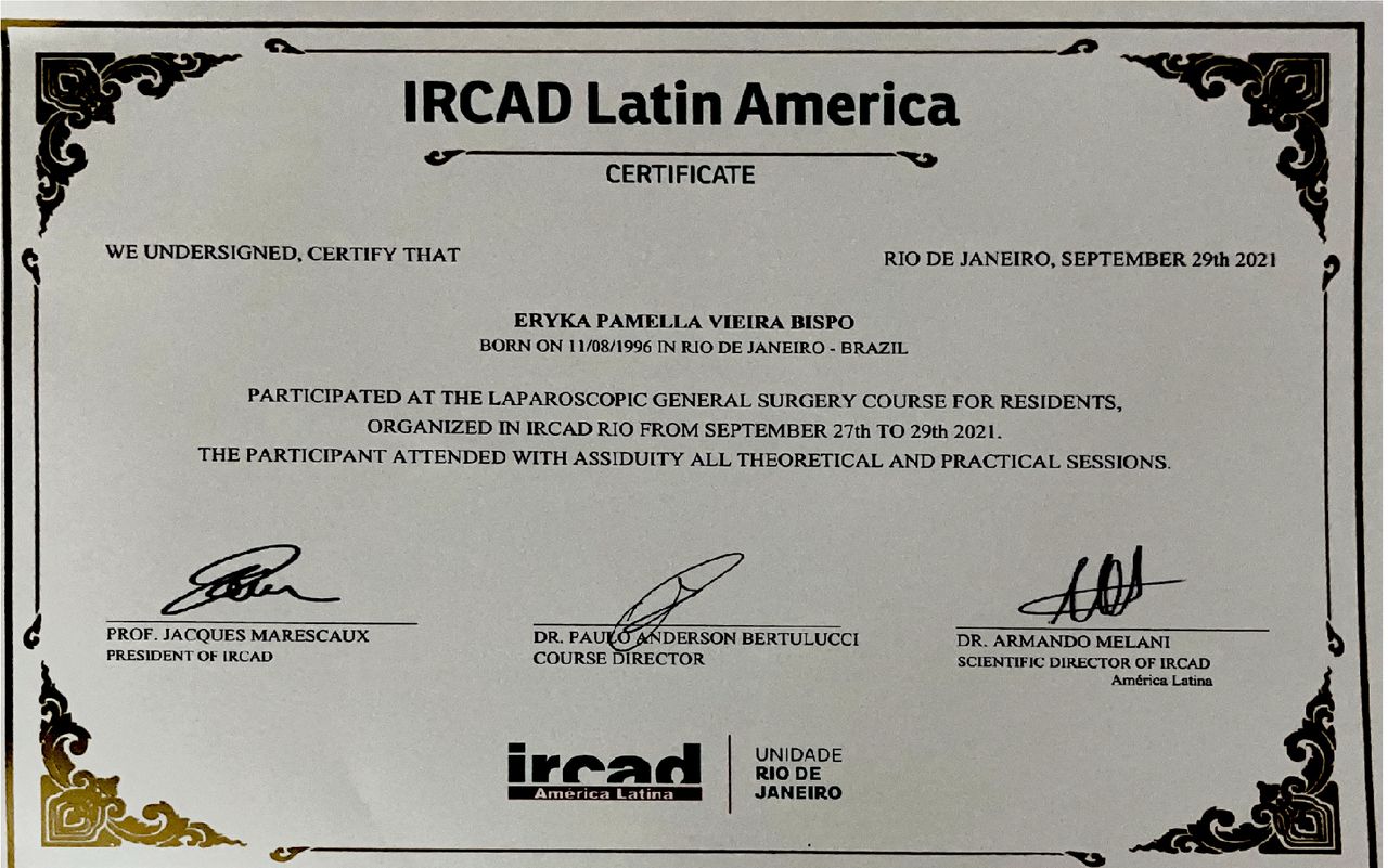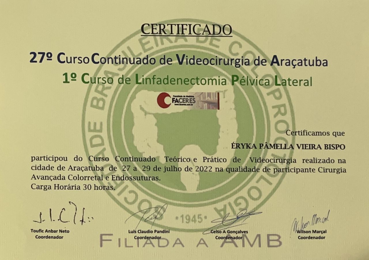 Realizo constante atualização, incluindo cursos em cirurgia robótica (Hospital Sírio-Libanês), cirurgia laparoscópica (IRCAD) e videocirurgia colorretal.
