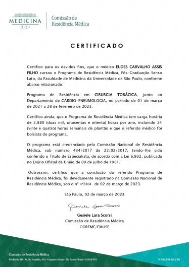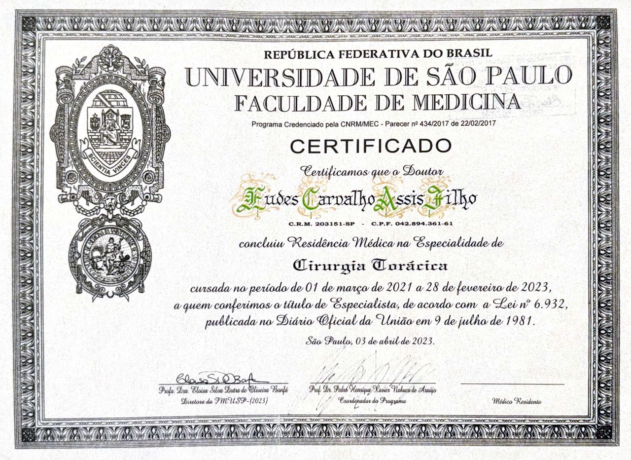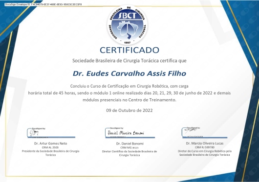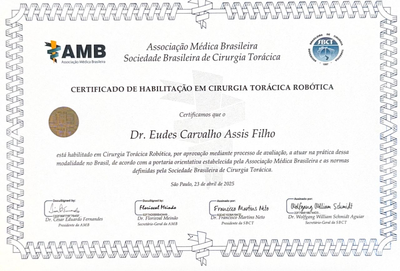 Iniciei a carreira médica através da graduação no Centro Universitário do Planalto Central-DF, realizei residência médica em Cirurgia Geral pelo Complexo Hospitalar do Mandaqui-SP e residência médica em Cirurgia Torácica pelo Hospital das Clínicas da Faculdade de Medicina de São Paulo (HCFMUSP-SP). Bem como, capacitação em Cirurgia Torácica Robótica pela Sociedade Brasileira de Cirurgia Torácica e AMB. Atuo principalmente em cirurgia torácica minimamente invasiva para doenças oncológicas torácicas, doenças infecciosas pulmonares, controle cirúrgico de hiperidrose, correção de defeitos congênitos da parede torácica (pectus escavatum e carinatum), doenças do mediastino, hérnia diafragmática e outras.