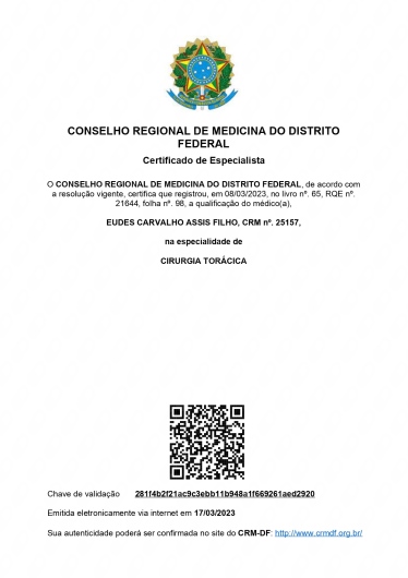 Quais são as principais especialidades de Eudes Carvalho Assis Filho?Eudes Carvalho Assis Filho é cirurgião torácico. Te mostramos alguns dos serviços oferecidos pelo especialista graças à sua trajetória e vasta experiência: Consulta Cirurgia Torácica, Primeira consulta Cirurgia Torácica, Retorno de consultas Cirurgia Torácica, Lobectomia Pulmonar, Broncoscopias, Simpatectomia, Videotoracoscopia, Teleconsulta, Encaixe Telemedicina, Consulta por telemedicina particular.