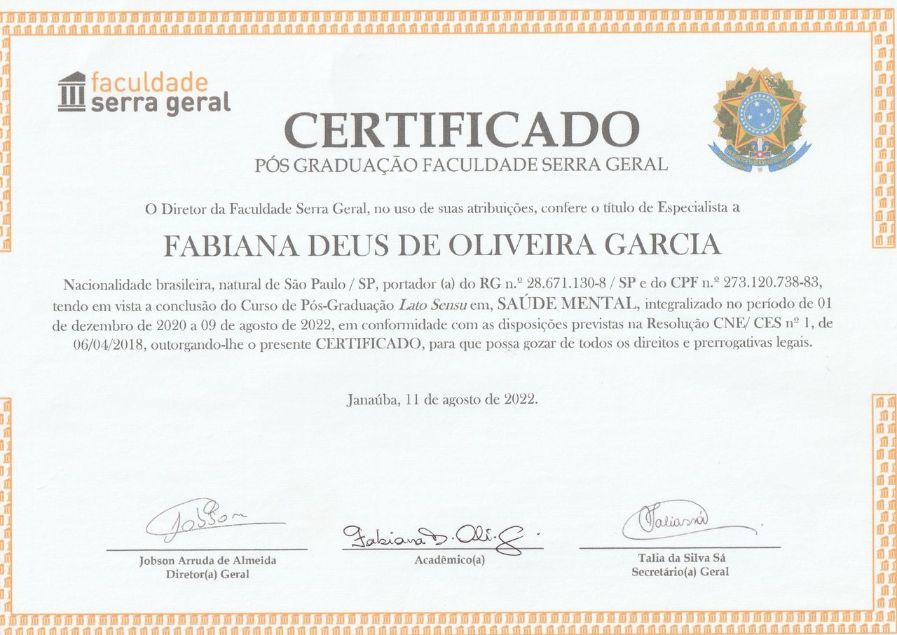 Quais são as principais especialidades de Fabiana Garcia?Fabiana Garcia é psicóloga. Te mostramos alguns dos serviços oferecidos pelo especialista graças à sua trajetória e vasta experiência: Teleconsulta, Atendimento Online em Psicoterapia, Psicoterapia online, Atendimento Psicológico online para adulto, Atendimento psicológico online, Terapia online, Primeira consulta psicologia.