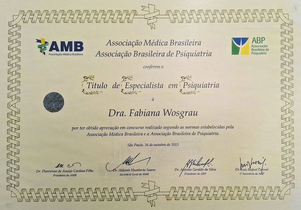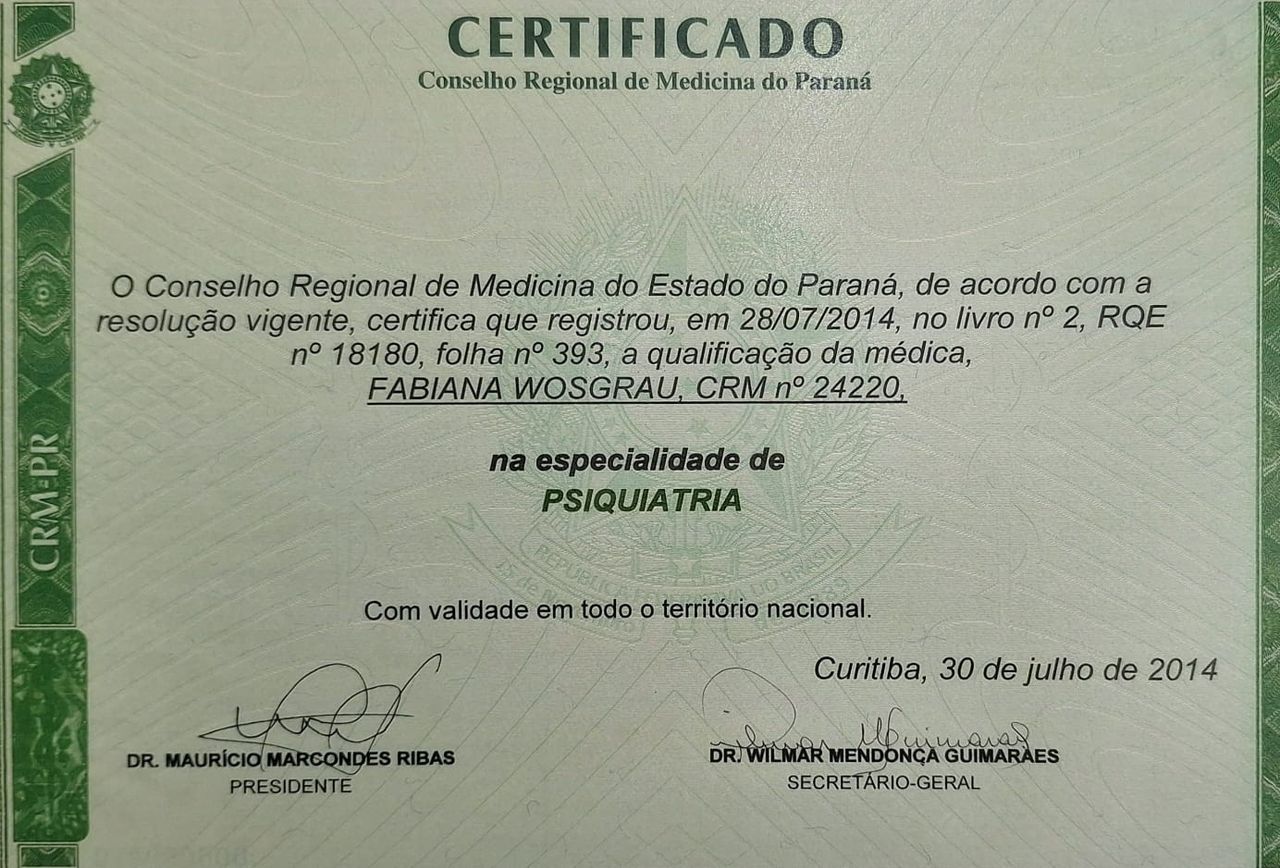 Quais são as principais especialidades de Fabiana Wosgrau?Fabiana Wosgrau é psiquiatra. Te mostramos alguns dos serviços oferecidos pelo especialista graças à sua trajetória e vasta experiência: Primeira consulta Psiquiatria, Tratamento da ansiedade, Tratamento Adicção, Tratamento de transtornos alimentares, Tratamento para bulimia nervosa, Consulta Psiquiatra, Transtorno de déficit de atenção e hiperatividade - TDAH, Tratamento da depressão, Tratamento da esquizofrenia e outros transtornos psicóticos, Consulta de retorno.