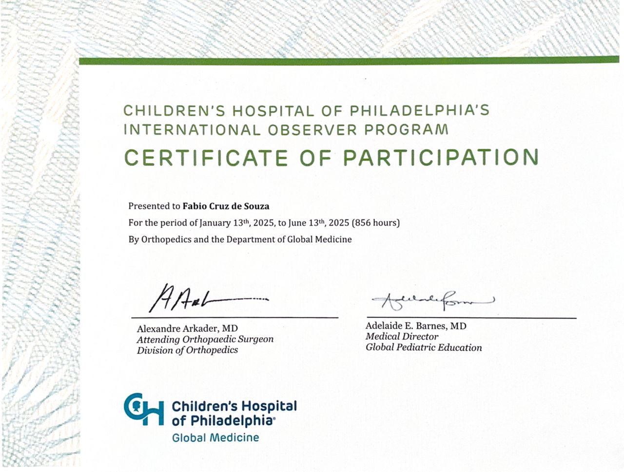 Buscando aprimoramento contínuo e as melhores práticas globais, realizei um Observership em Ortopedia Pediátrica no Children's Hospital of Philadelphia, nos Estados Unidos, uma experiência que enriqueceu profundamente minha visão e abordagem clínica.
