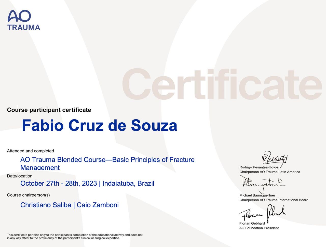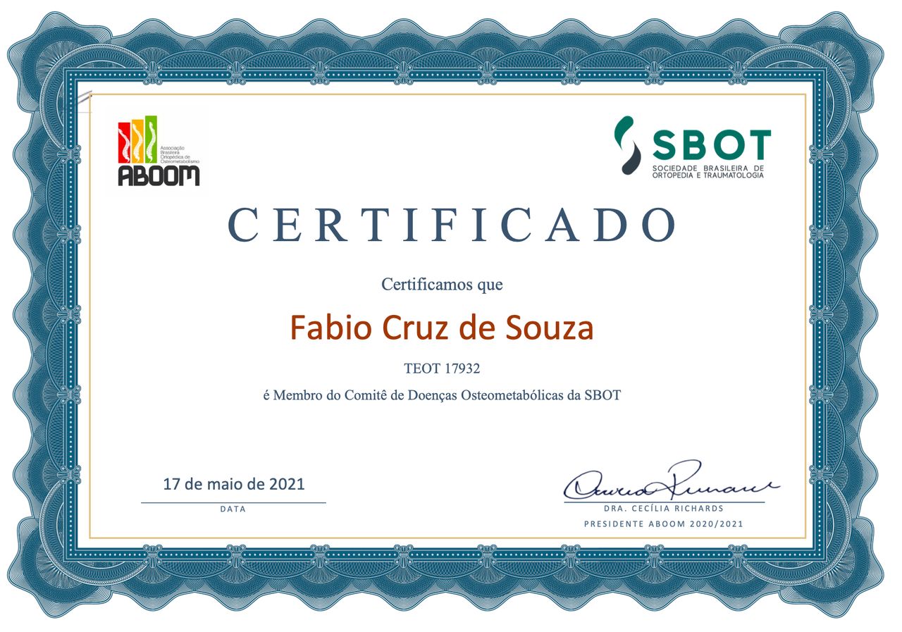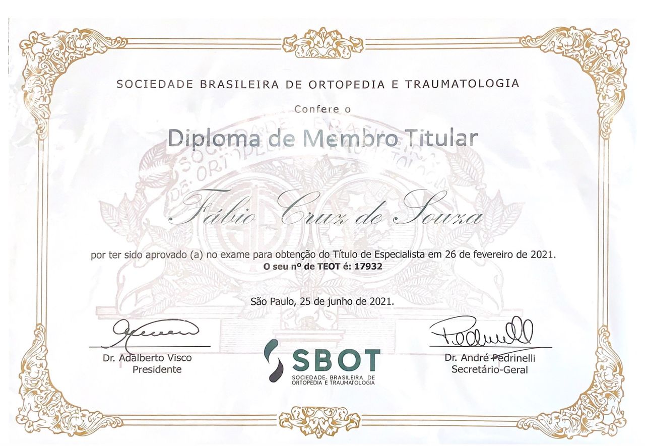 Membro Titular da Sociedade Brasileira de Ortopedia e Traumatologia (SBOT) e Membro da Associação Brasileira Ortopédica de Osteometabolismo (ABOOM), o que reflete meu compromisso com a atualização constante e a adesão aos mais altos padrões da medicina.