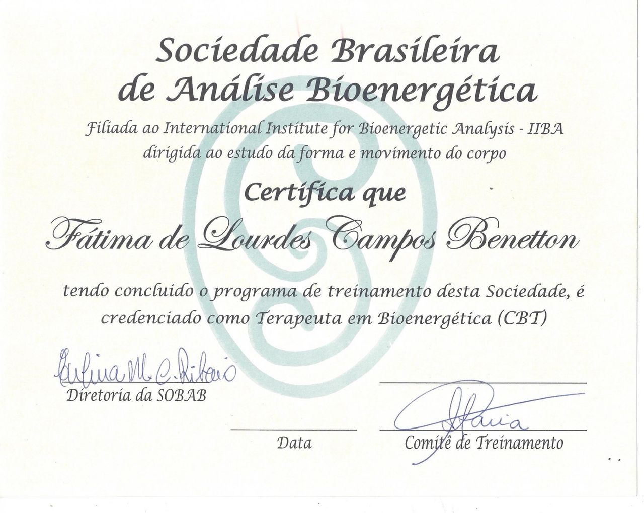 - Psicóloga (CRP 06/38117) com especialização em Psicoterapia Reichiana (Instituto Sedes Sapientiae - SP). - Analista Bioenergética pela Sociedade Brasileira de Análise Bioenergética (SOBAB), filiada ao International Institute for Bioenergetic Analysis (NY). - Terapia Comunitária Integrativa (Polo de Formação Instituto Afinando a Vida - IAV). - Formação em Esquizoanálise (Escola Nômade - Luiz Fuganti). Cursos complementares: - Psicologia Corporal (Escola Paulista de Psicologia), Psicanálise Winnicottiana (Centro Winnicott de Campinas) e Cuidando do Cuidador (Adalberto Barreto, criador da Terapia Comunitária Integrativa).