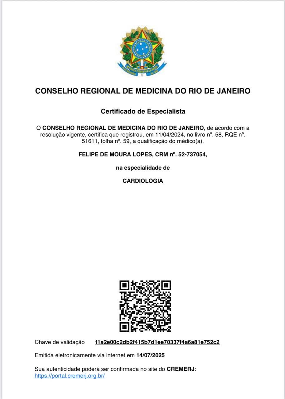 Quais são as principais especialidades de Felipe De Moura Lopes?Felipe De Moura Lopes é cardiologista, médico clínico geral, intensivista. Te mostramos alguns dos serviços oferecidos pelo especialista graças à sua trajetória e vasta experiência: Avaliação do risco cirúrgico, Avaliação pré-operatória, Check up, ECG (eletrocardiograma), Consulta Cardiologia, Prevenção cardiovascular, Avaliação para esportes, Avaliação cardiológica para atletas, Tratamento para insuficiência cardíaca, Avaliação e tratamento da doença coronária.
