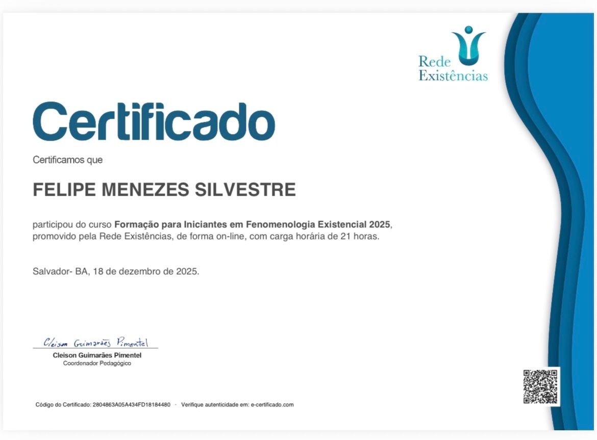 Sou psicólogo clínico com abordagem Fenomenológico-Existencial. Atendo adolescentes, adultos e idosos em um espaço de escuta sensível, ética e acolhedora. Tenho experiência com diferentes demandas, como depressão, ansiedade, luto, questões afetivas, relacionamentos, conflitos familiares, cuidado com demandas LGBTQIAP+, sofrimento no trabalho, uso abusivo de substâncias, crises existenciais, etc. Meu trabalho é pautado no respeito à singularidade de cada pessoa e na construção de um vínculo que permita refletir, sentir e encontrar novos caminhos diante dos desafios da vida.