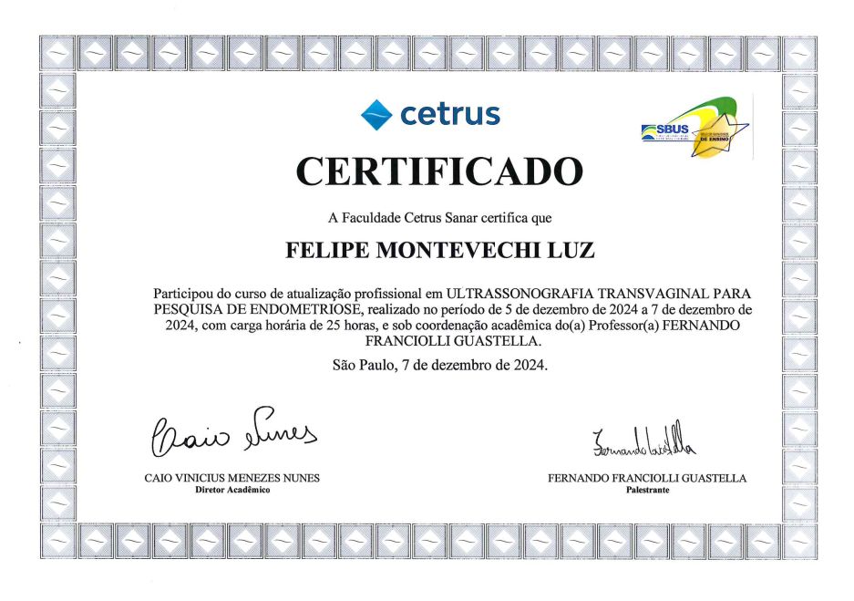 Sou especialista em mapeamento e pesquisa de Endometriose por Ultrassom com preparo intestinal. Atendo exclusivamente particular. Sou médico radiologista especialista em Endometriose com Mestrado e atualmente no Doutorado, com formação totalmente realizada na UNICAMP (Universidade Estadual de Campinas).