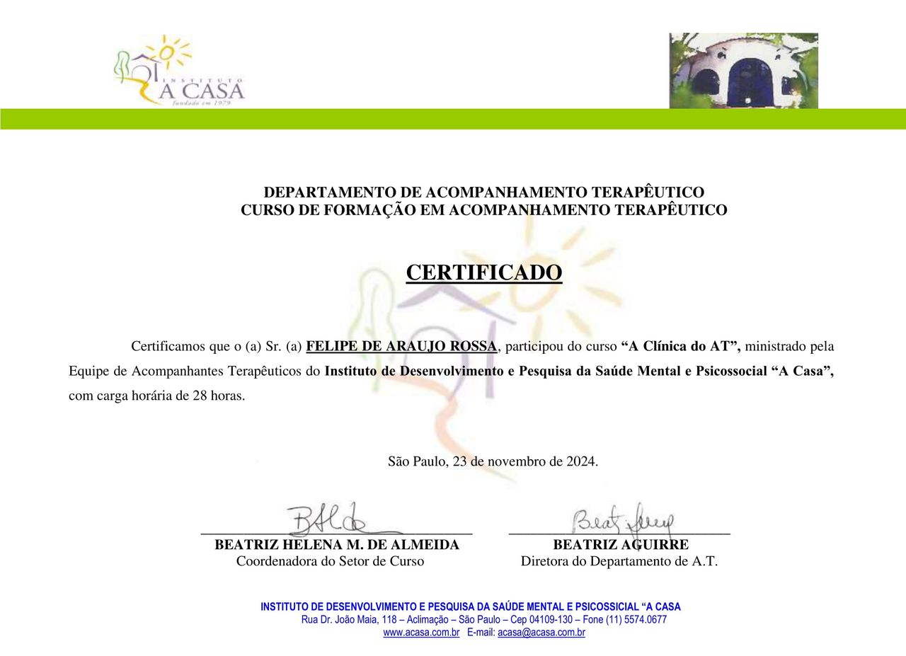 Quais são as principais especialidades de Felipe Rossa?Felipe Rossa é psicólogo. Te mostramos alguns dos serviços oferecidos pelo especialista graças à sua trajetória e vasta experiência: Primeira consulta psicologia, Acompanhamento Terapêutico (AT), Tratamento de depressão, Tratamento de transtorno bipolar, Psicanálise, Tratamento para esquizofrenia, Consulta psicológica do adulto, Tratamento da ansiedade, Tratamento para transtorno de ansiedade, Teleconsulta.