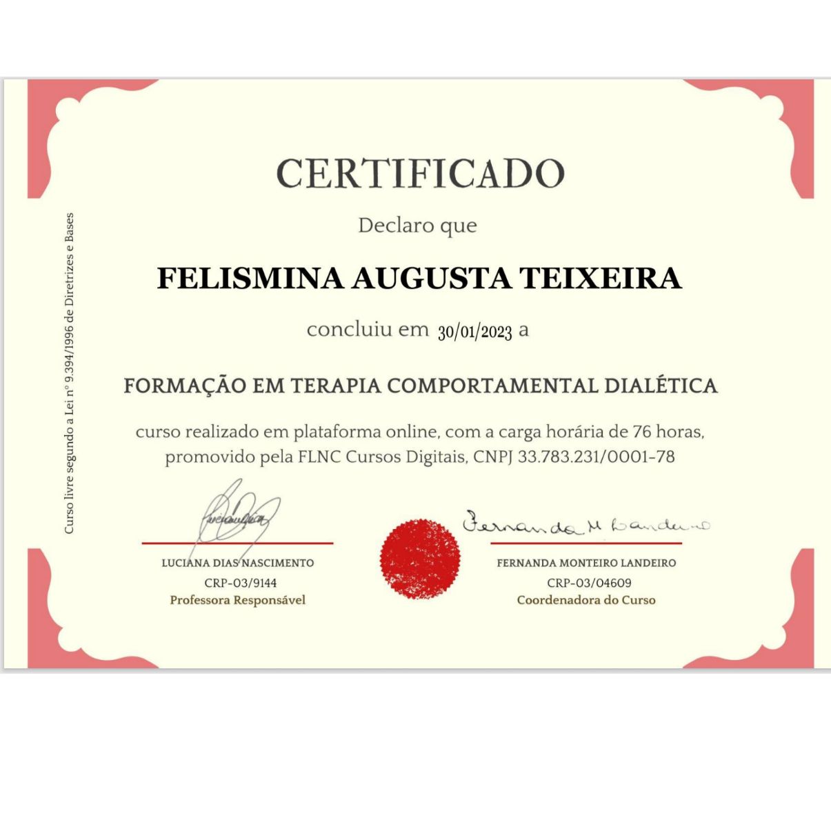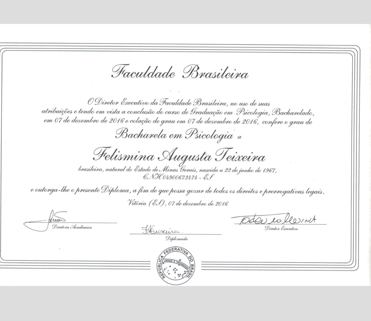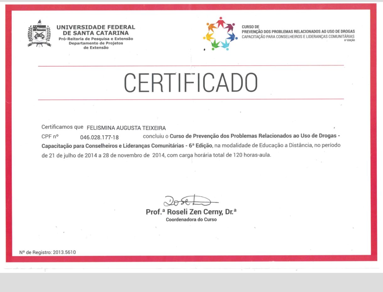 Sou Felismina Teixeira, psicóloga com pós-graduação em Terapia Cognitivo-Comportamental (TCC) e Terapia do Esquema.