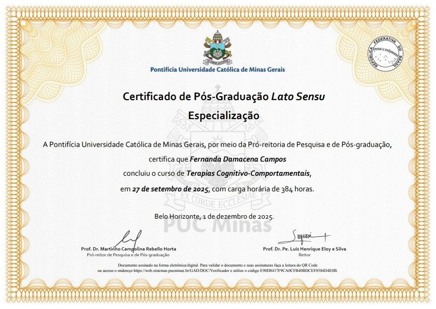 Olá, meu nome é Fernanda Campos, sou Psicóloga Clínica formada pelo Centro Universitário Newton Paiva. Atualmente sou pós-graduanda em Terapia Cognitivo-Comportamental (TCC) pela PUC Minas, abordagem em que fundamento meus atendimentos. Em meu período acadêmico também tive experiências práticas com a Orientação Profissional, Psicologia Escolar, Psicologia Social e Avaliação Psicológica.