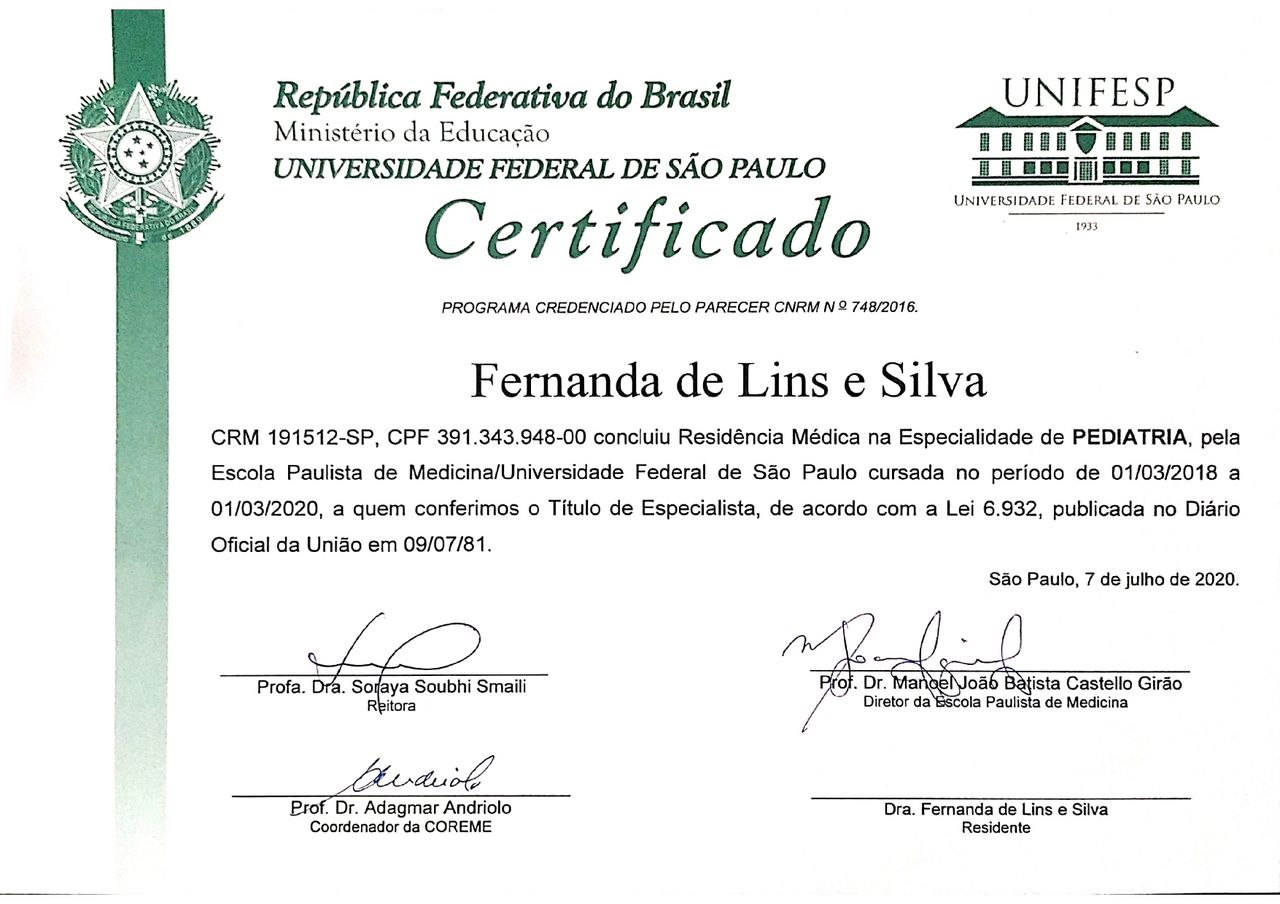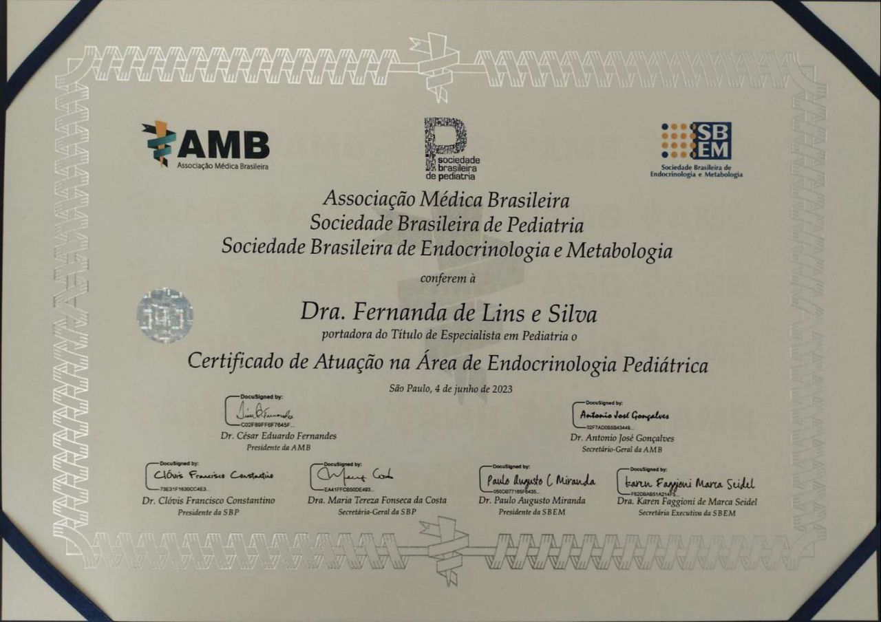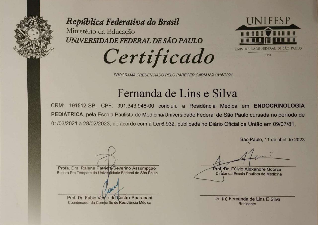 Completei minha especialização com a Residência Médica de Endocrinologia Pediátrica na Universidade Federal de São Paulo (EPM - UNIFESP), e tenho Título de Especialista na área de Atuação de Endocrinologia Pediátrica pela Associação Médica Brasileira (AMB) / RQE Nº 1075111.