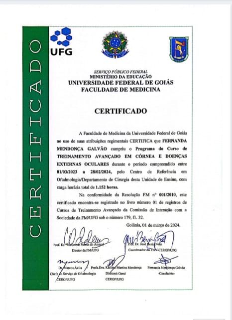 Sou graduada em Medicina pela PUC Goiás e fiz minha especialização em Oftalmologia na Universidade Federal de Goiás, onde também realizei o treinamento avançado em Córnea e Doenças Externas Oculares.