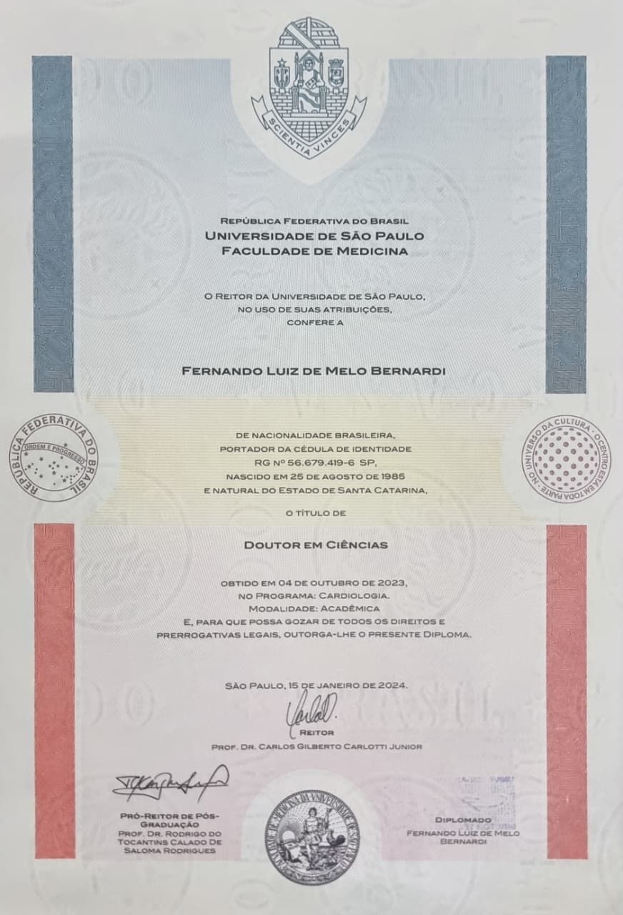 Sou também Doutor/PhD em Cardiologia pela Faculdade de Medicina da Universidade de São Paulo (USP), tendo feito fellow no Instituto Universitário de Cardiologia e Pneumologia de Québec, Canadá.
