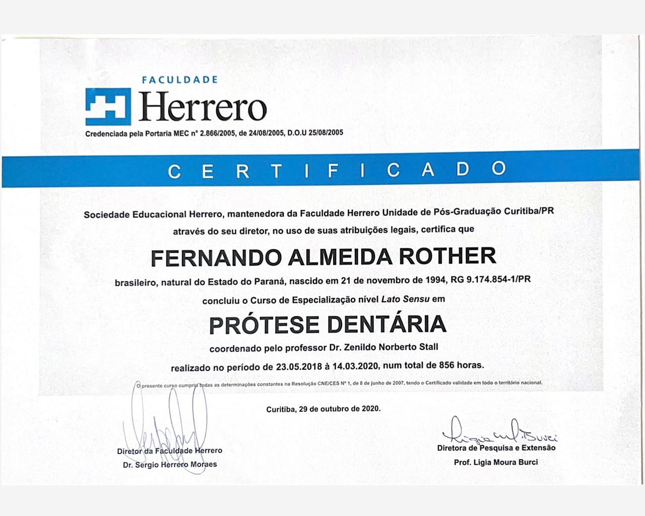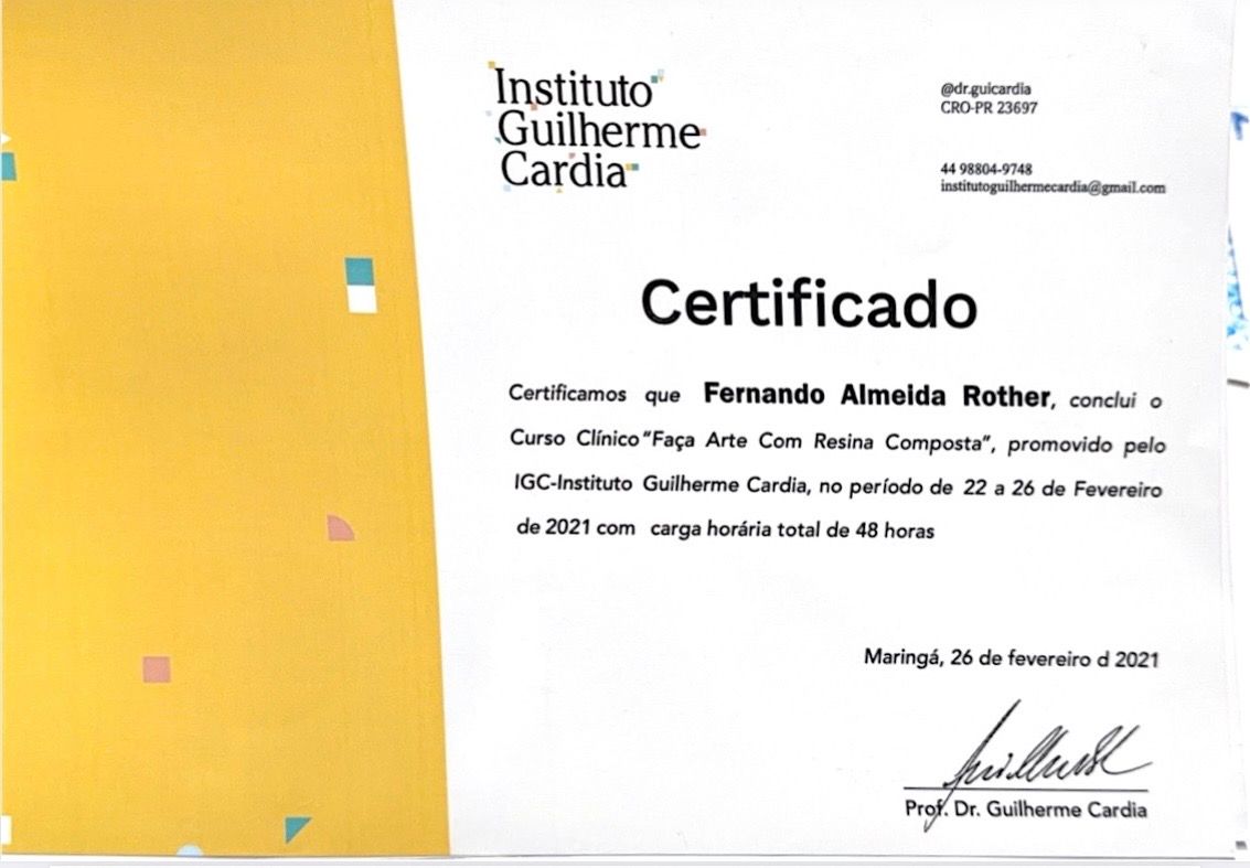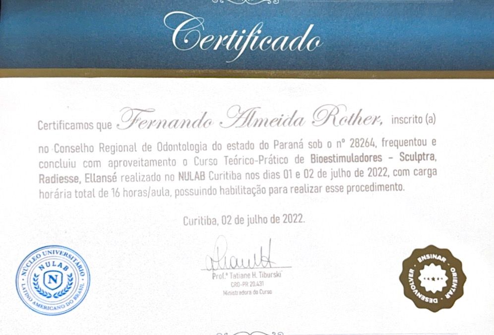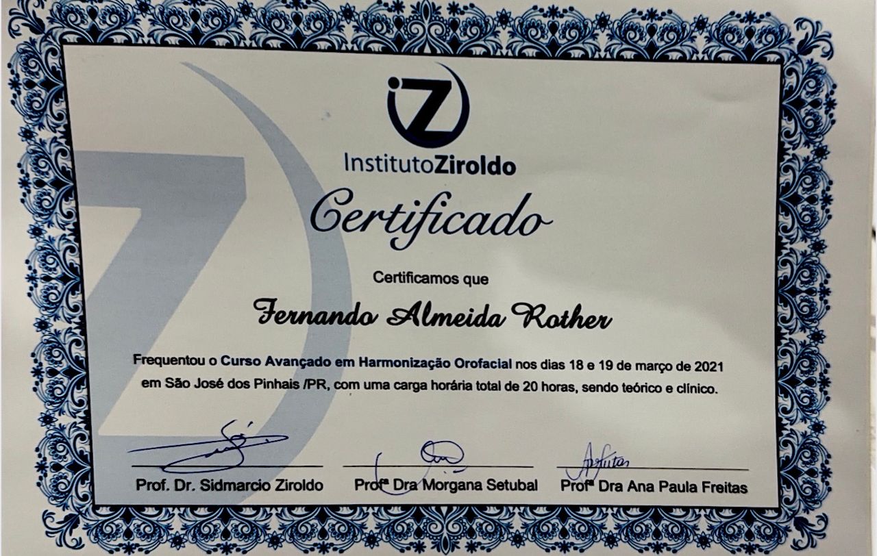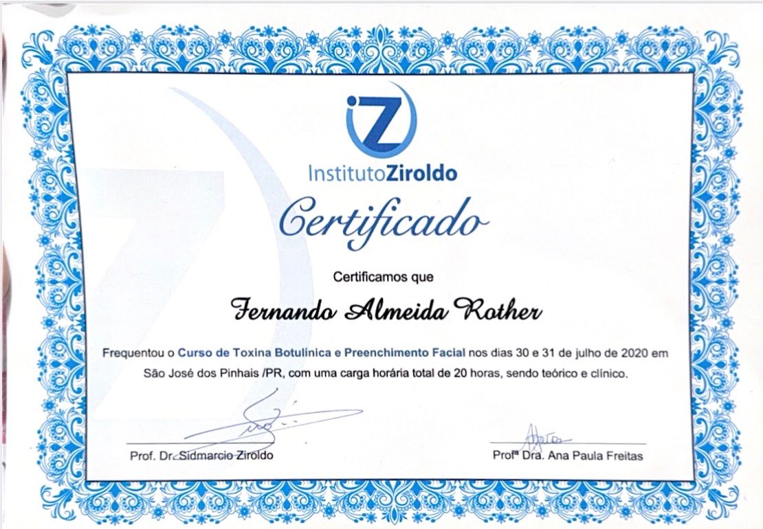 Sou cirurgião-dentista, formado pelo Centro Universitário Uingá em 2017. Possuo especialização em Prótese Dentária, aperfeiçoamento em Endodontia e ampla formação em Harmonização Orofacial, com cursos básico e avançado em toxina botulínica e preenchimento facial.